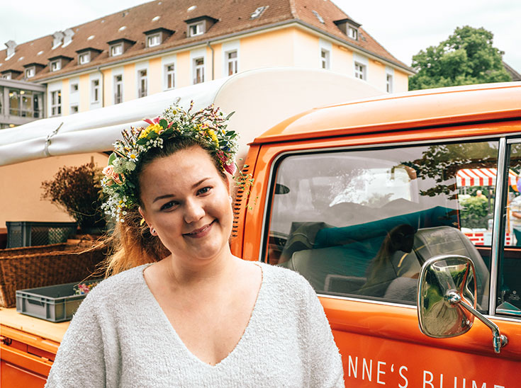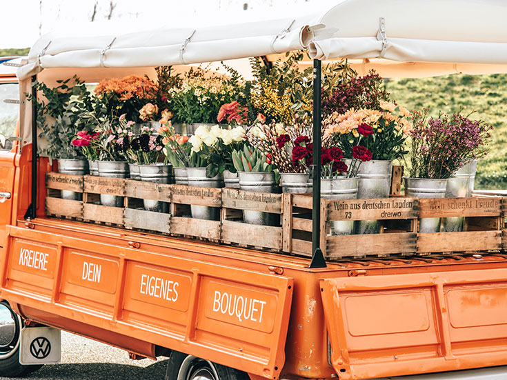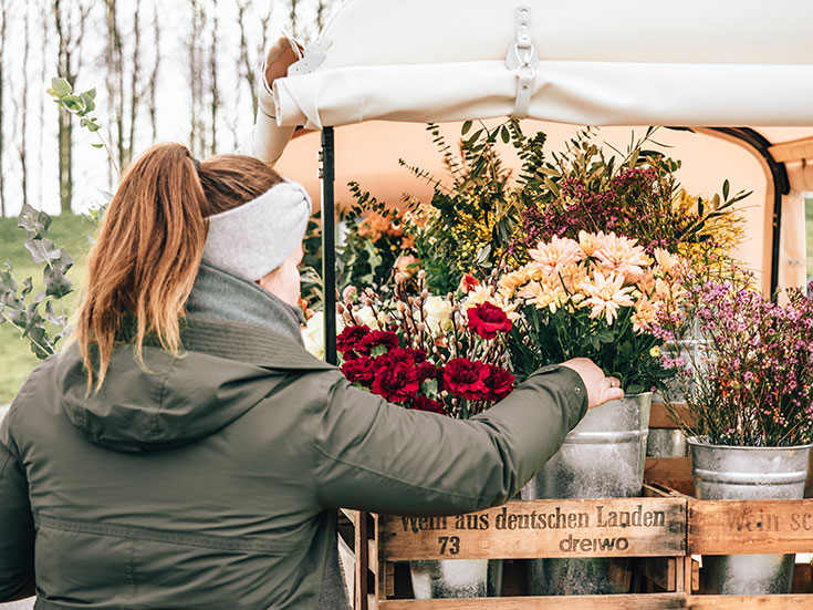 Blumen bereichern uns. Machen den Alltag bunter. Doch viele Menschen schaffen es nicht in den Blumenladen. Aus Zeitgründen. Oder auch aus Altersgründen. »Ich wollte mobil sein und die Blumen zu den Menschen bringen, die nicht selbst zu den Blumen kommen. Mit Else stehe ich vor Unternehmen. So können sich Menschen in der Mittagspause oder nach Feierabend ihren Strauß gleich mitnehmen«, erklärt uns Anne. Der Gedanke dahinter ist großartig. Besonders berufstätige Menschen lassen sich Bouquets oft via Bote zusenden. Verpackungsmaterial, Plastik, Paketdienste – alles andere als nachhaltig. Außerdem spendet Anne regelmäßig Blumen. Zum Beispiel, wenn nach den Events, die sie regelmäßig begleitet, Sträuße oder Blumen übrigbleiben. Dann packt Anne alles in ihr blumiges Mobil und bringt die blühenden Kreationen zu alten oder kranken Menschen. So entsteht kein Müll und Anne kann im Namen ihrer Kund*innen ein Stück Blumen-Glück weitergeben.