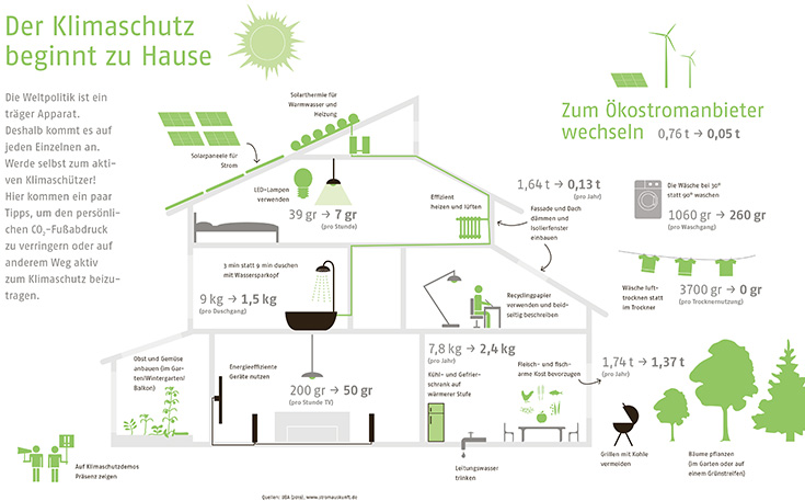 »Die Weltpolitik ist ein träger Apparat« schreibt Esther Gonstalla in ihrem Buch. Deswegen sind wir gefragt! Um zum Klimaschutz beizutragen, gibt es viele Möglichkeiten. So ist es sinnvoll, im eigenen Heim LED-Lampen zu nutzen, die Energie sparen. Wer effizient heizt und lüftet, kann auch schon einen großen Teil zum Klimaschutz tun. Oder wie wär‘s mit einem hauseigenen Gemüsegarten? Es gibt etliche Optionen, den Alltag nachhaltiger und umweltfreundlicher zu gestalten. Das Wichtigste ist aber, in kleinen Schritten zu starten und das eigene Handeln nach und nach zu verändern. Das können beispielsweise auch kleine Dinge sein, wie Leitungswasser trinken, kürzere Duschen nehmen, Wäsche draußen trocknen oder zum Ökostromanbieter wechseln. Das Feld ist riesengroß, leg los!