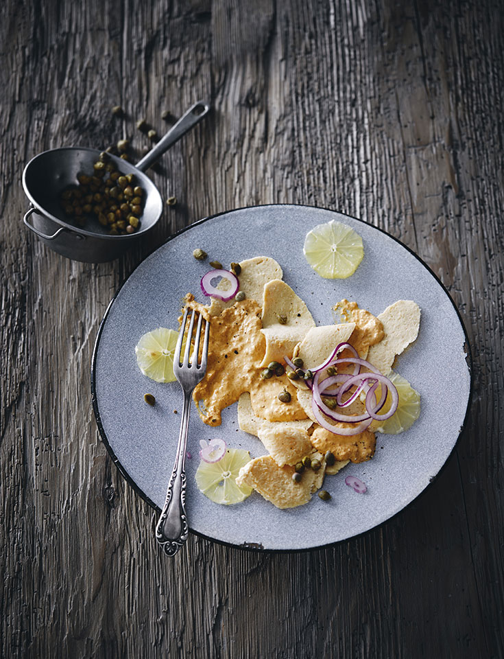 3 | Die Sauce über den Quornscheiben verteilen und mit Zwiebelringen, Zitronenscheiben und Kapern garnieren.