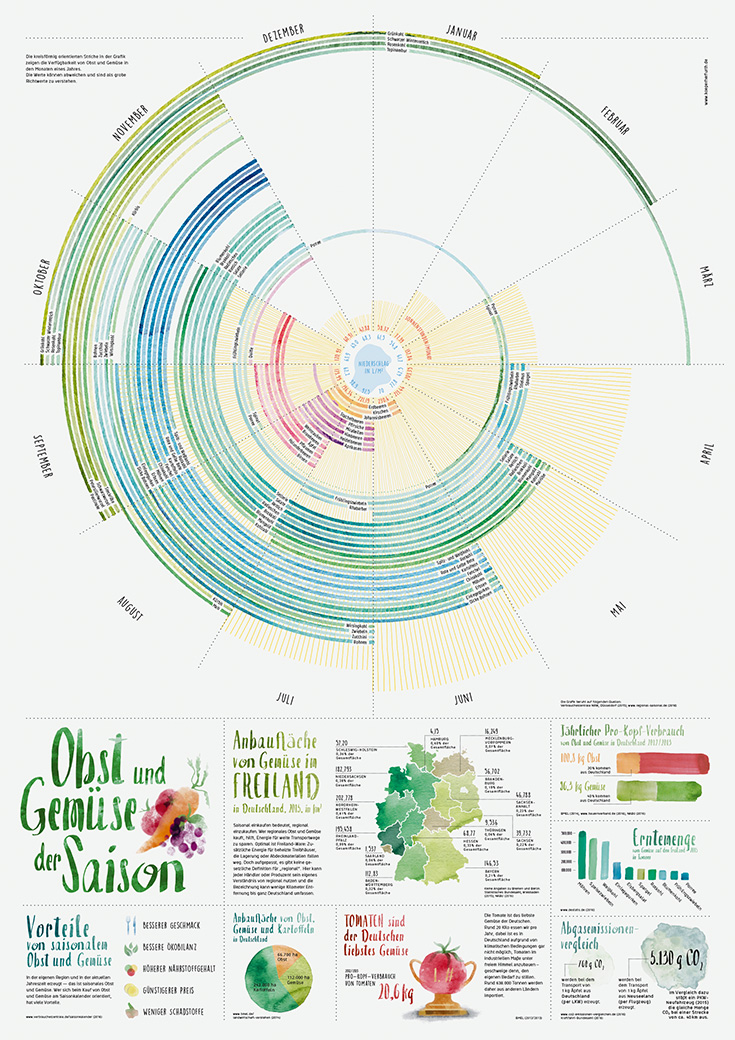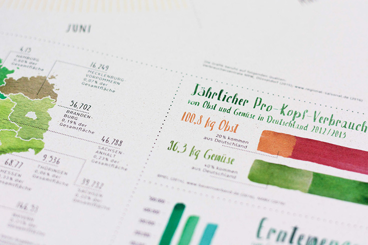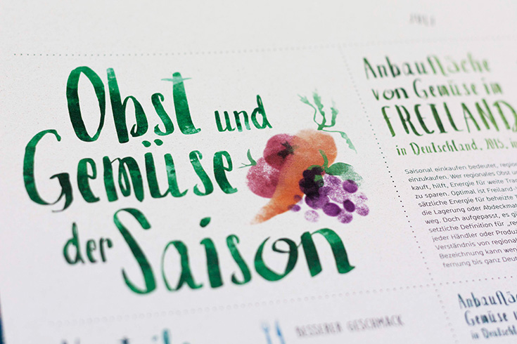 Deutschland hat ein breites Angebot an Obst und Gemüse aus Freilandanbau. Das Gemüse der Saison Poster ist eine Hommage an all die Leckereien aus der Region. Der Kalender ist klimaneutral gedruckt. Dafür nutzt das Designbüro KoeperHerfurth Papier, bei dem bis zu 15% Zellstoff durch Reste der Lebensmittelproduktion ersetzt werden. Es ist FSC-zertifiziert und wird mit erneuerbarer Energie produziert.