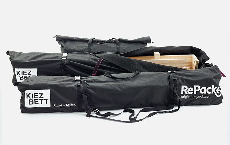 Ein regionaler Betrieb im Raum Berlin-Brandenburg, der das Holz fachgerecht behandelt und es so besonders langlebig macht, verarbeitet die Kiefer und sägt die Bretter für unser Traumbett. Nach einer schonenden Trocknung geht es für die Bett-Bretter weiter in eine Förderwerkstatt, in der das Kiezbett in seine Formen kommt. Gemeinsam mit der Stephanus Stiftung arbeiten in Berlin Spandau beeinträchtigte Menschen mit Behinderungen in liebevoller Handarbeit daran, allen Kiezbett-Besitzer*innen wunderschöne Nächte zu bescheren. Wurden alle Ecken gefräst, alle Kanten geschliffen und alle Teile kontrolliert, geht das Zero Waste Bett auf die Reise. Ein eigens für das Label designte Verpackungssystem des finnischen Labels RePack bringt das Kiezbett sicher in die eigenen vier Wände. Die wiederverwendbaren Tragetaschen erinnern an große Reisetaschen und waren wirklich eines meiner Highlights. Man bedenke nur die unzähligen Kartons, Plastiksäckchen und Styroporpuffer von anderen Möbelherstellern, die mit dieser Pfandverpackung eingespart werden. Die komplette Verpackung wird am Ende in einer einzigen RePack-Tasche verstaut, die dann einfach per Post zurück an Kiezbett geschickt wird. Grüne Klasse statt Plastik-Masse! Für kurze Berliner Wege nutzt das Label passende Lastenräder.