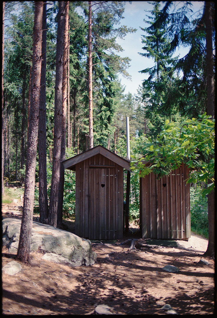 Das Gebiet von Vildmarks Camping ist in unterschiedliche Camps eingeteilt und die Gesamtfläche besteht aus über 80 Hektar beinahe unberührter Natur. Ohne Zaun. Ohne Strommasten. Ohne feste Straßen. Roman und ich fanden unseren Stellplatz im »Main Camp«. Sowohl dieses als auch das »Camp Outback« verfügen über eine Küche, in der wir mit Gas kochen konnten, eine kleine Sauna, die mit selbst gehackten Holz geheizt wird, eine Kühl-Keller-Höhle, einem Dusch-Häuschen, das mit »Dusch-Sonnen-Säcken« funktioniert und – Plumpsklos. Gewöhnungsbedürftig. Machbar. Nachhaltig und wassersparend. Neben den beiden Hauptcamps gibt es noch weitere, kleine Camps, die mit Toiletten ausgestattet sind. Die Servicehäuser sind zu Fuß alle in 5 bis 10 Gehminuten erreichbar. »Eagle Point«, »Channel Island« oder »Moose Camp« sind noch ruhiger und abgelegener. Man kann sowohl mit dem Van/Wohnmobil als auch mit dem Zelt »einchecken«.