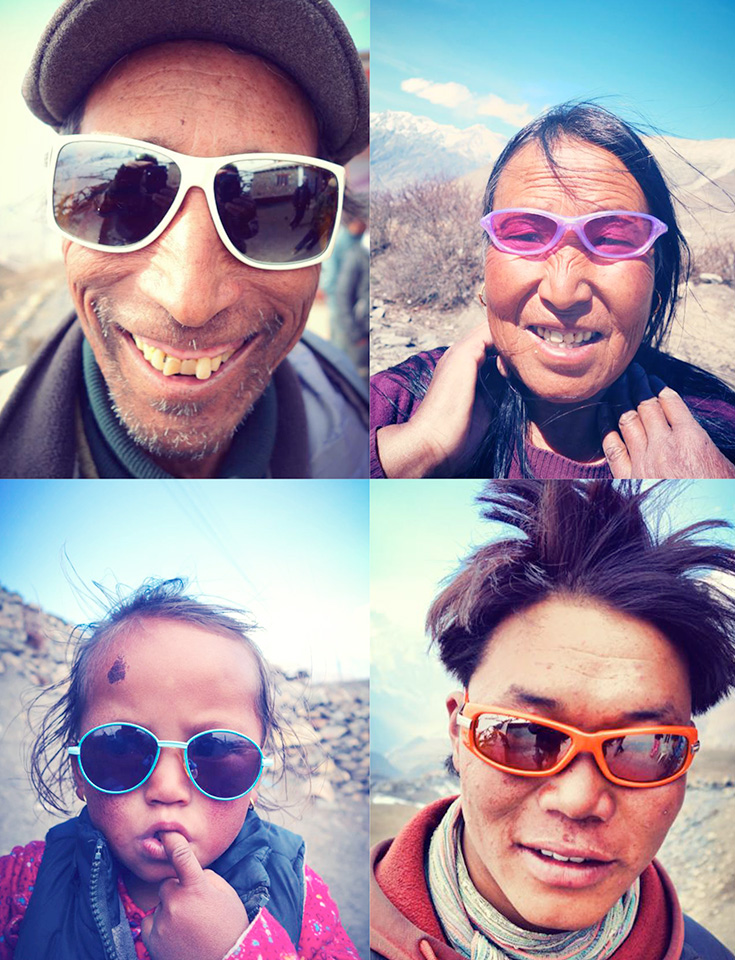 Oh ja, die Brillen von Europa aus ins Himalaya Gebirge zu bekommen, ist nach wie vor eine Herausforderung. Ich bin quasi permanent auf der Suche nach Leuten, die meine Brillen mit rüber nehmen. Ich selber nehme die Brillen bei jeder Reise mit ins Gepäck – statt mit Privatsachen sind meine Koffer immer randvoll mit Sonnenbrillen… Aber auch Privatleute kommen auf mich zu und fragen mich, ob sie Brillen auf ihrer Reise in die Region mitnehmen können. Und ich gehe mittlerweile gezielt auf Reiseveranstalter und frage diese, ob die Urlauber Brillen in ihrem Gepäck transportieren und diese vor Ort bei Freunden von mir abgeben können. Das klappt wunderbar. Wo ein Wille ist, sind auch viele kreative Wege… Vor ein paar Jahren kam das Rucksack-Unternehmen Deuter, das eine Schule in Katmandu unterstützt, auf mich zu, weil es über 1.000 Rucksäcke in die vom Erdbeben erschütterte Region schicken wollte. Sie hatten noch Platz in ihrem Container frei und so und konnte ich kostenlos knapp 2.000 Brillen verschiffen. So etwas sind natürlich tolle Symbiosen!