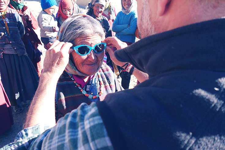 2004 habe ich mir eine Auszeit von meinem damaligen Job genommen und bin zum ersten Mal nach Ladakh gereist. Mit einem Motorrad bin ich in entlegene Bergdörfer gefahren und habe für eine Kinderorganisation Spielzeug und Bekleidung an bedürftige Kinder verteilt. Weil mich die Begegnungen mit den Menschen dort so berührt haben, bin ich die Jahre darauf immer wieder in diese Region geflogen. Dort habe ich dann unter anderem auch zum ersten Mal bei einem Augencamp mitgeholfen und gemerkt, dass dieses für uns simple und überall zu erstehende Gut Sonnenbrille dort quasi nicht existiert, obwohl es gerade für diese Menschen kein schickes Lifestyle-Accessoire ist, sondern eine lebenswichtige Ausstattung. Also habe ich nach meiner Rückreise kurzerhand eine Sammelaktion in meinem Café (Anmerkung der Redaktion: die liebevoll eingerichtete Aroma Kaffeebar im hippen Münchner Glockenbachviertel) gestartet und Optiker um Unterstützung gebeten. 2009 bin ich dann mit rund 300 Brillen im Gepäck nach Ladakh geflogen, habe mir vor Ort ein Motorrad gekauft (das seitdem dort steht, und bei jedem Besuch auf mich wartet) und bin damit in die Bergdörfer gefahren. Ich habe die gesammelten Brillen verteilt und – als Referenz für die Optiker – Fotos von den glücklichen, neuen Brillenbesitzern gemacht. Vor zwei Jahren bin ich dann zum ersten Mal auch nach Nepal gereist. Inzwischen arbeite ich dort mit der größten Augenklinik in Katmandu zusammen, die regelmäßige Eye Camps in den abgelegenen Bergregionen organisiert.