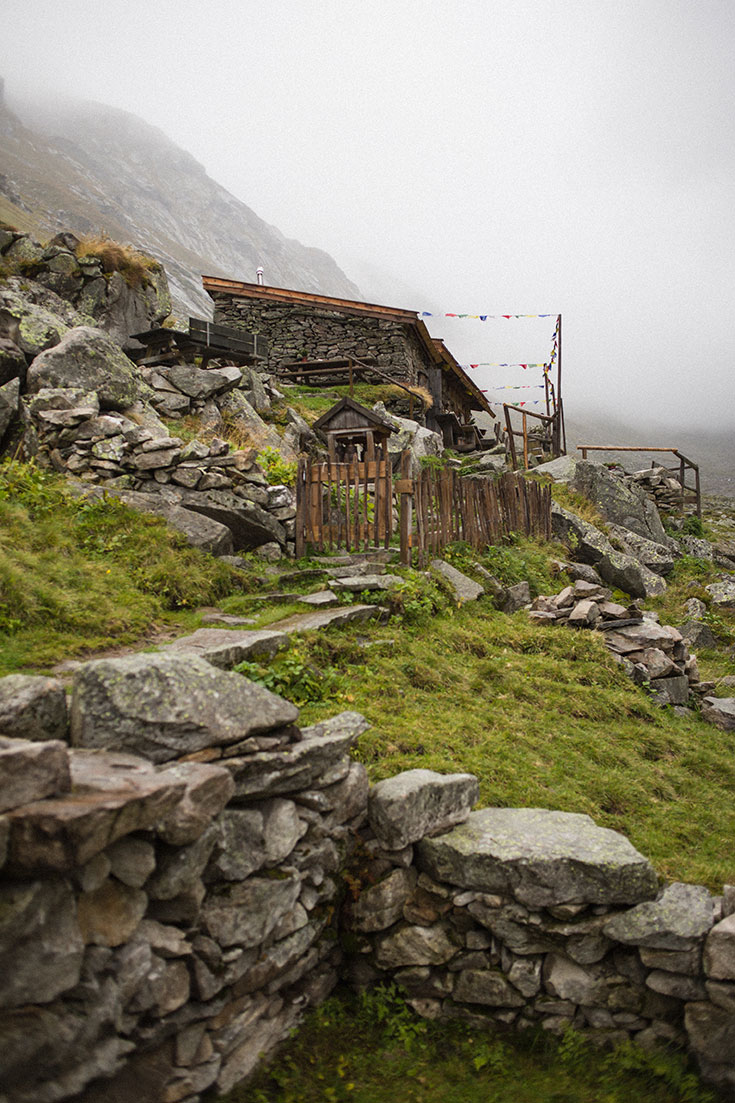 Nach knapp 2 Stunden Slow Hiking Deluxe unter tibetischen Gebetsfahnen entlang, vielen, tiefen Atemzügen, staunenden Blicken und tausenden Momentaufnahmen, die unsere Seele wie ein Schwamm aufsaugt, sehen wir fünf große Stoffbahnen im Wind erstrahlen. Die Alm – wir haben es geschafft. Niemand ist zu sehen. Als ich um die Ecke biege, sehe ich zwei freilaufende Schweine und drei Hühner, die mich verdutzt anschauen. Mein Herz macht einen Sprung! Wir nähern uns dem Haus, das aussieht, als ob jeder einzelne Stein mit Hand aufeinandergesetzt wurde. Ein Hund, wie ein großer, grauer Wolf kommt uns entgegen. Hinter ihm eine junge Frau. Wir bestellen Tee und selbstgemachten Apfelkuchen. Und eine Käse-Jause dazu. Sie erzählt uns, dass sie mit zwei anderen Frauen hier lebt. Sie haben keinen Strom, außer einer Solaranlage, kein fließendes Wasser. Der Bach habe 8 Grad – hier waschen sie sich während der sechs Monate, in denen sie die Alm bewirten. Während wir ihren Worten lauschen trocknen meine nassen Wollsocken am Kamin. »Du lernst dich wirklich ganz anders kennen in der Zeit hier«, seufzt sie und hält den Blick sanft in die Ferne. Oh, wie sehr wir sie verstehen. Denn schon nach ein paar Stunden in diesem wunderschönen, rauen und doch so sanften Tal fühlen wir uns entschleunigt und ganz geerdet. Auf dem Rückweg pfeile ich schon an meiner Bewerbung für die Almbewirtung im kommenden Jahr. Servus!