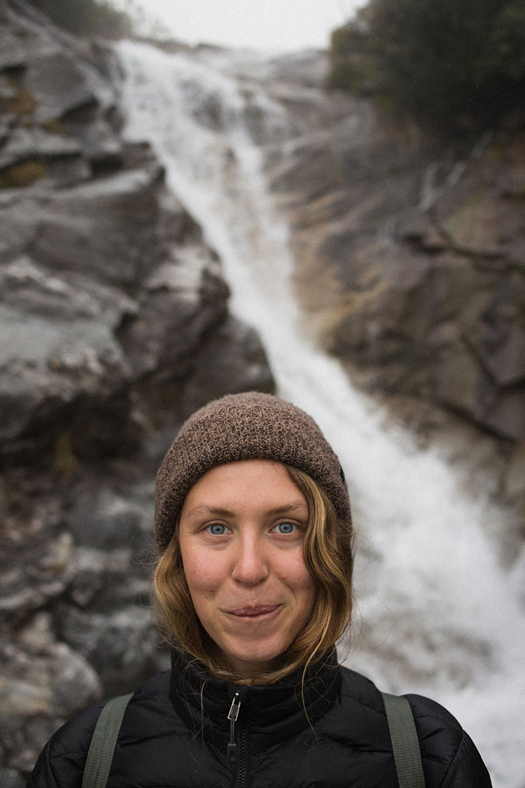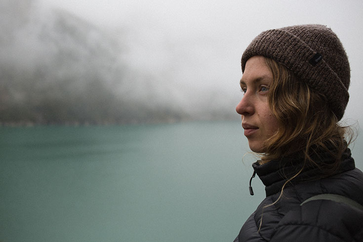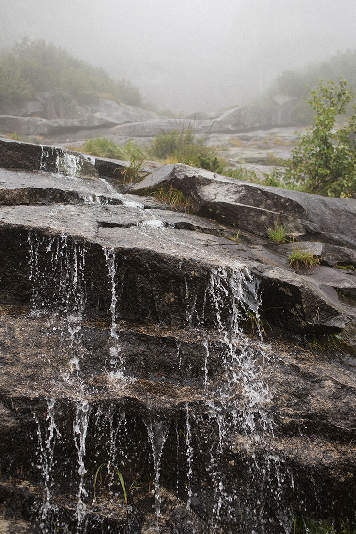 Der Tunnel führt uns auf einen Schotterweg. Links steile Wände, rechts Tiefe. Wir sehen kleine Fetzen des türkisfarbenen, schimmernden Stausees, der sich durch die Nebelfronten hindurchfunkelt. Keine 100 Meter weiter tost und tobt schon der erst Wasserfall von einem kleinen Berg hinab bis in den See. Regen von oben, Wasser von der Seite, Wasser unter uns. Alles fließt. Schritt für Schritt. Es begegnet uns eine Gruppe Vorzeige-Funktionskleidungs-Mitfünfziger, die meine bereits durchnässten Barfußschuhe belächeln. Die drei werden in den nächsten drei Stunden die einzigen Menschen sein, die uns begegnen.