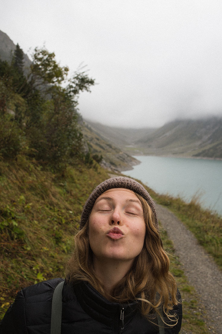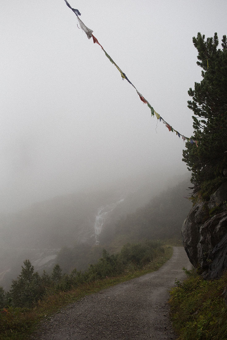 Circa 20 Minuten später stolpern wir aus dem Gipfelstürmer. Wow. Wir sehen: Nichts. Eigentlich sollte ein großer Stausee vor uns liegen. Kurz frage ich mich, ob wir mit dem schnittigen Omnibus nicht einfach hoch ins Jenseits geiert sind. Aber es fühlt sich alles ganz echt um mich an. Dicker, fetter Nebel. Nieselregen. Kurzer Blickaustausch zwischen Roman und mir. Fenja hatte uns erst gestern Abend von Klein Tibet erzählt und wir schmissen, locker flockig und mit Sonnenschein im Nacken, die Wanderpläne um und entschieden uns spontan für die kleine Hide-Away-Wanderung. Jetzt stehen wir im Niesel-Nebel-Regen und blicken in weiße Schleier-Wolken.