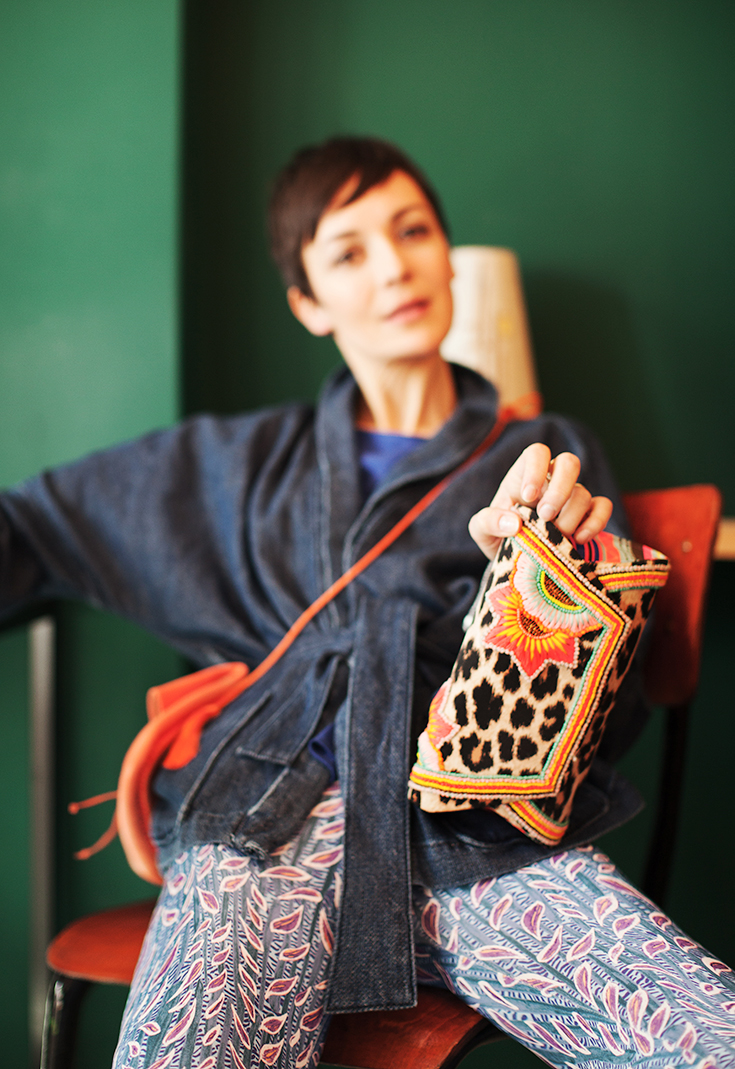 Wild thing: Jeansjacke im Kimono-Look von Kings of Indigo* aus Biobaumwolle, 110 Euro. Gemusterte Leggings von Under the Same Sun aus recyceltem PET über Glore Hamburg, 99 Euro. Königsblaues Top aus Tencel von Wunderwerk* über Glore Hamburg, 79, 95 Euro. Aprikotfarbene Berbertasche, 99 Euro, mit Stickereien verzierte Clutch im Leo-Look , 420 Euro, beides von Abury*.