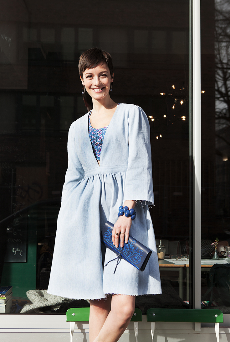 Bluetiful! Blaue Jeansjacke mit goldenen Knöpfen (beziehungsweise Schellen), von Black Velvet Circus, 179 Euro. Königsblaues Top aus Tencel von Wunderwerk* über Glore Hamburg, 79, 95 Euro. Blaue Hose mit Schleifengürtel in Jeansoptik aus Tencel von Wunderwerk*, 99,95 Euro. Espadrilles aus pflanzlich gefärbtem Leder von Act Series*, 110 Euro. Blaue, bestickte Lederclutch von Abury*, 169 Euro. Handgefertigte Kette von En Inde über sugartrends.de*, 607 Euro. Ring, privat.