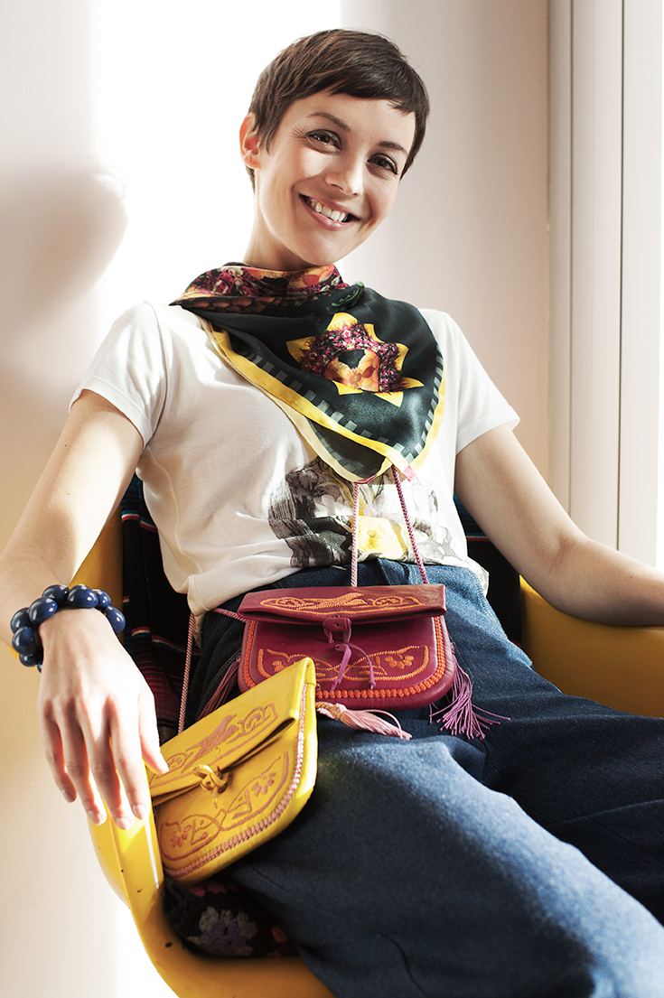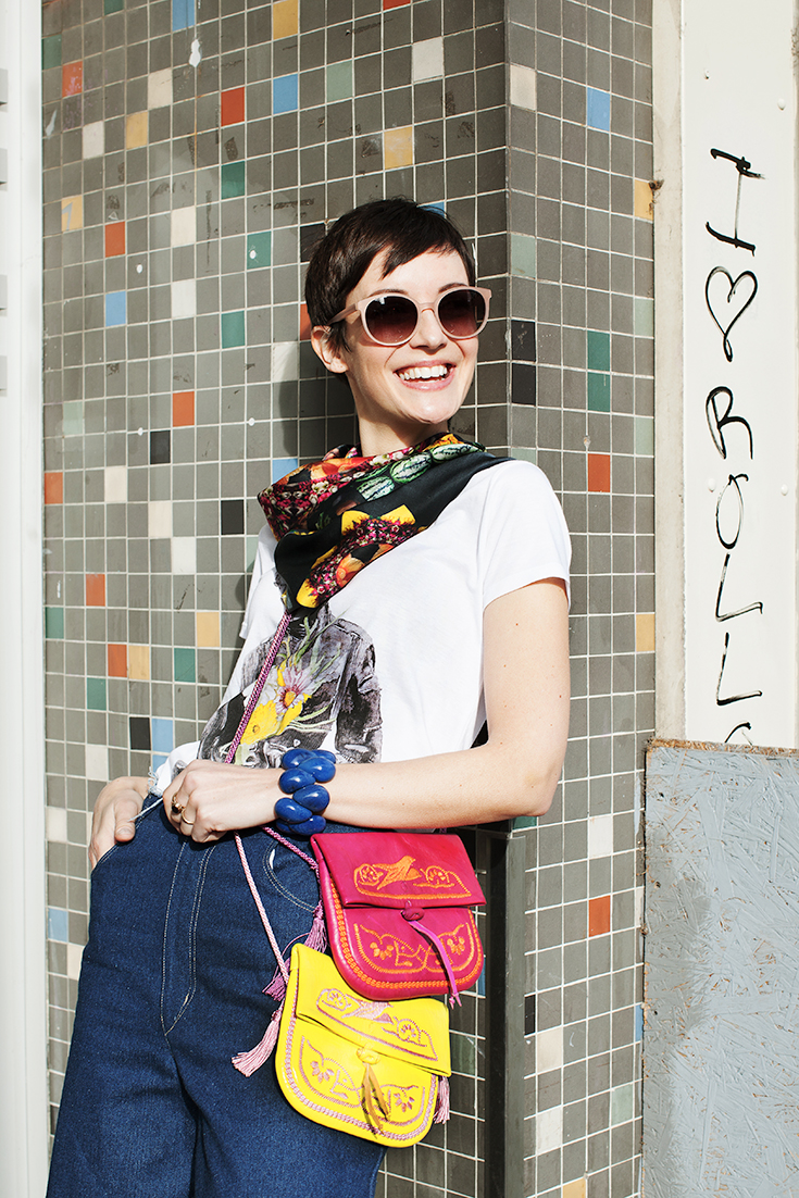 T-Shirt »Robot Flower« aus Biobaumwolle von Wunderwerk*, 49,95 Euro. Highwaist Jeans mit ausgefransten Säumen von Black Velvet Circus, 150 Euro. Blaues Armband von Organic Tagua Jewlery über abury.net, 39 Euro. Sonnenbrille »The Charming« von Viu, 145 Euro. Handgefertigte Berbertaschen in Pink und Gelb, je 99 Euro, beide von Abury*. Tuch mit Mandala-Print aus Bio-Seide von Cocccon über sugartrends.de*, 149 Euro.
