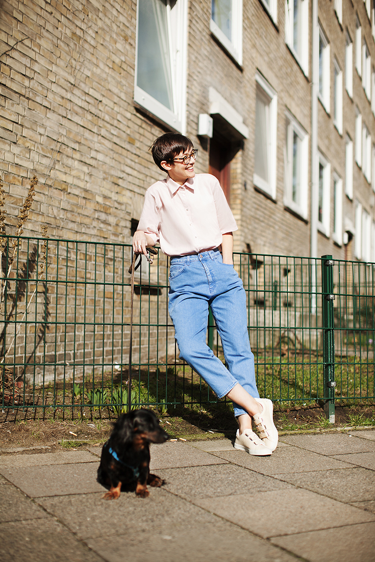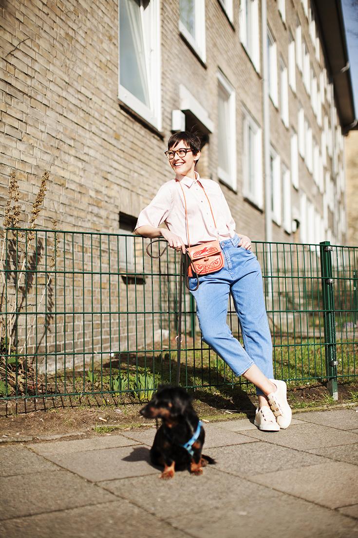 Tiefenentspannte Zaungäste: Pelle hält nach anderen Vierbeinern Ausschau, während Tine die Sonnenstrahlen genießt. Rosafarbene Bluse aus Biobaumwolle von By Signe* , 118 Euro. Hellblaue Momjeans aus Biobaumwolle von Haikure* , 140 Euro.Cremefarbene Sneaker mit Klettverschluss und Naturkautschuksohle von Veja*, 99 Euro. Brille »The Ace« von Viu, 165 Euro. Ring »Minina« von Folkdays*, 84 Euro. Handgefertigte aprikotfarbene Berbertasche von Abury*, 99 Euro.