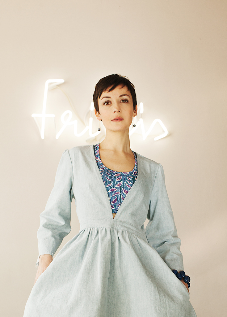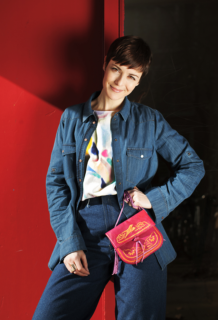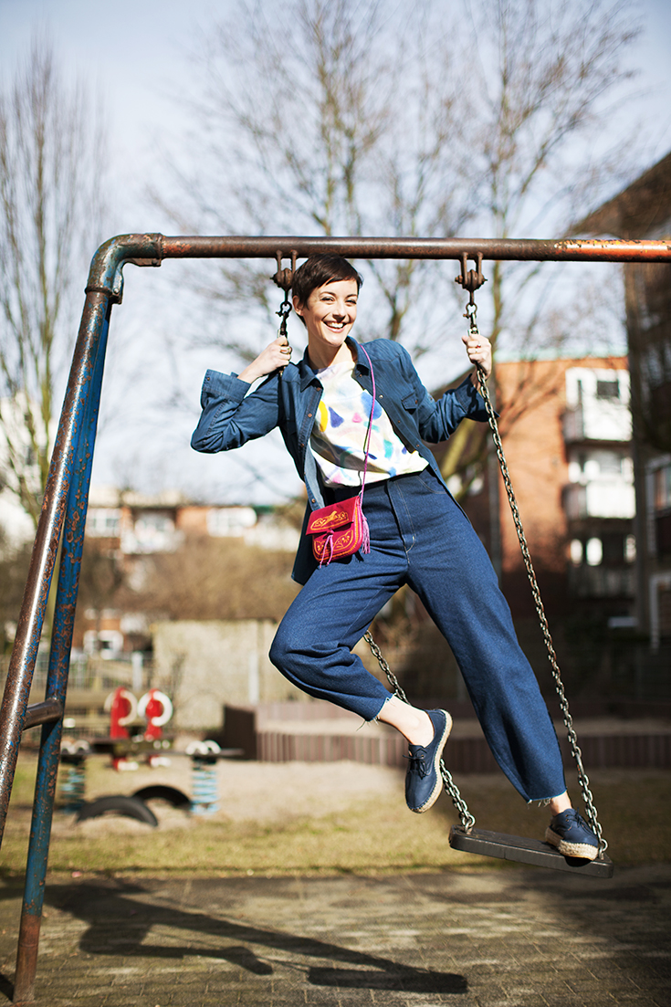 Blues mit Farbe: Tine trägt ein Jeanshemd aus Biobaumwolle von Hessnatur*, 99,95 Euro. Gemustertes Top von Lies in Layers x Stefan Marx 139 Euro. Highwaist Jeans mit ausgefransten Säumen von Black Velvet Circus, 150 Euro. Handgefertigte pinkfarbene Berbertasche von Abury*, 99 Euro. Blaue Espadrilles aus pflanzlich gefärbtem Leder von Act Series*, 110 Euro.