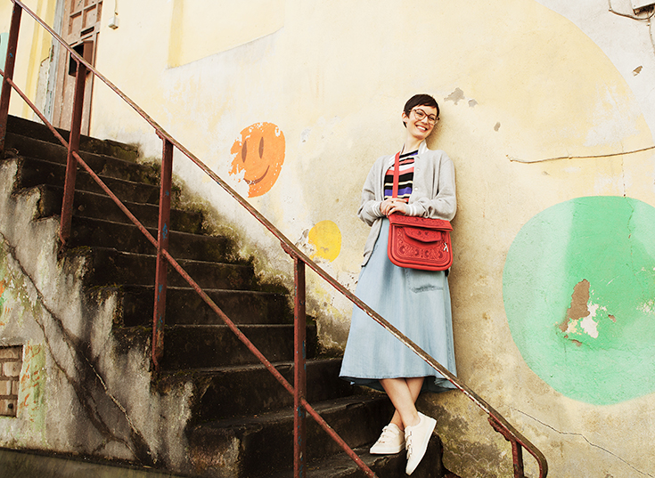 Style & Smile: Tine trägt eine hellgraue, super gemütliche Collegejacke aus Organic Cotton von Waterkoog, 75 Euro. Gestreiftes T-Shirt aus Trencel-Mix von Armedangels über Glore Hamburg, 44,90 Euro. Midi-Jeansrock aus Tencel von Cossac*, 120 Euro. Cremefarbene Sneaker mit Klettverschluss und Naturkautschuksohle von Veja*, 99 Euro. Handgemachte rote Berbertasche von Abury*, 249 Euro. Brille und Ringe, privat.