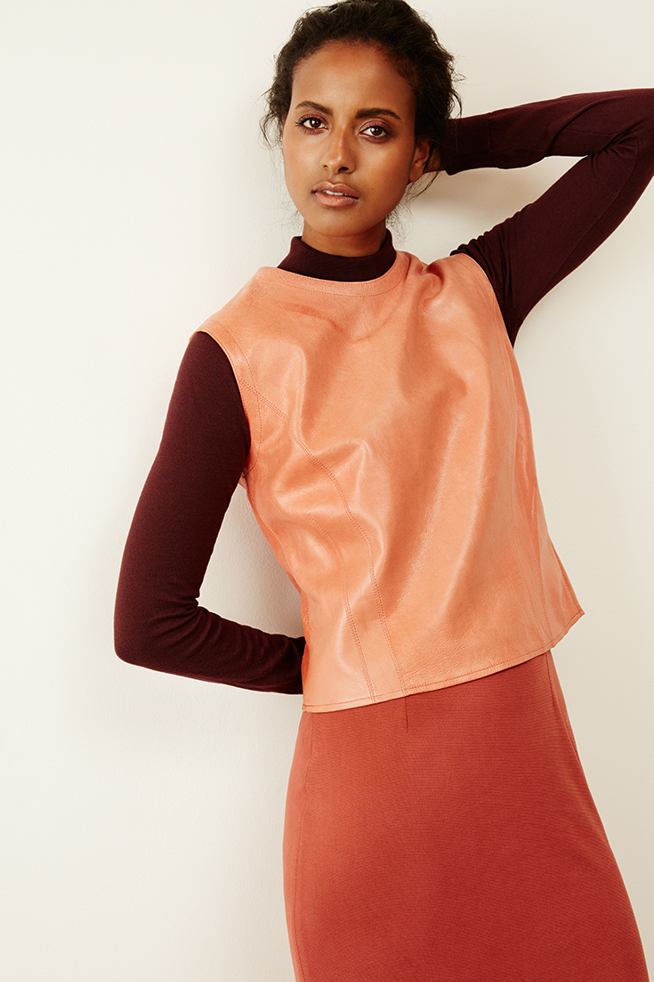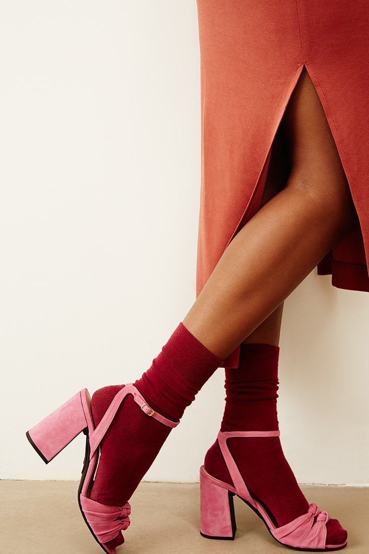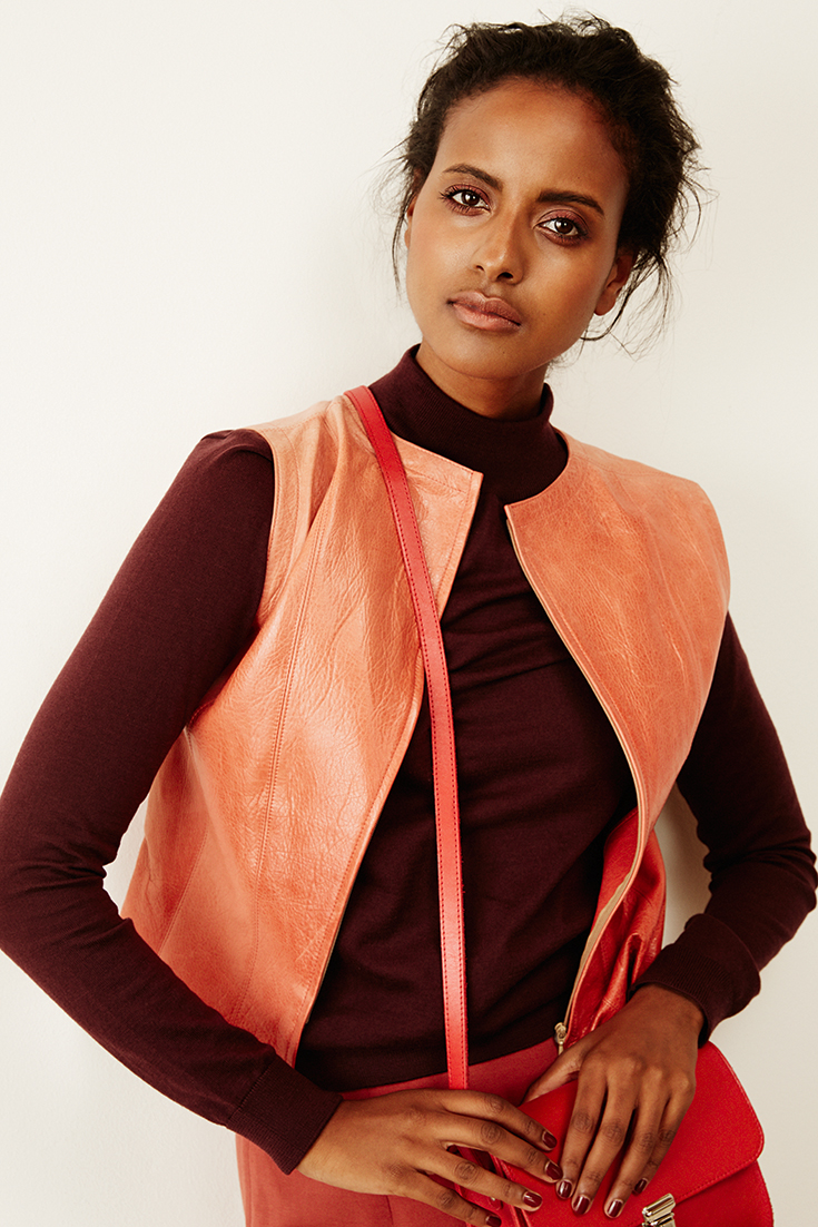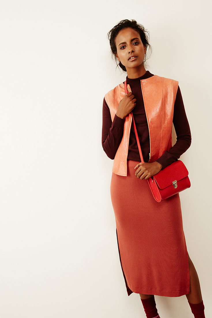 Red Red Shades – Bordeauxroter Strickpullover »Isadora« mit Stehkragen aus Biobaumwolle von Armedangels*, 59,90. Lachsfarbene Wende-Lederweste Vintage, (privat). Langer Rock mit Seitenschlitz aus Modal von Cossac*, ca. 120 Euro. Mohnrote Ledertasche (privat). Socken (privat). Pinkfarbene Sandaletten aus Veloursleder mit austauschbarem Absatz von Mime et Moi, 190 Euro (inklusive 2 Absätze). Herbstlich brauner Nagellack »Rust« von Kester Black über savuebeauty.com*, 15 ml, 19 Euro.