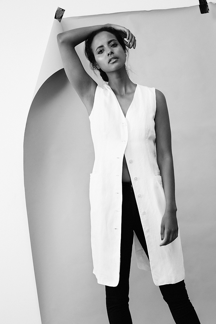 Westen Girl – Weiße Weste, die sowohl als Kleid als auch als Longweste getragen werden kann, aus Leinen von Max Mara (Vintage) über Studio Travel, ca. 170 Euro. Schwarze Denim »Christina« aus Biobaumwolle von Kings of Indigo*, 99,95. Rostroter Trenchcoat »The Duster« aus Tencel von Vetta, ca. 145 Euro. Brauner Vinatage-Filzhut (privat).