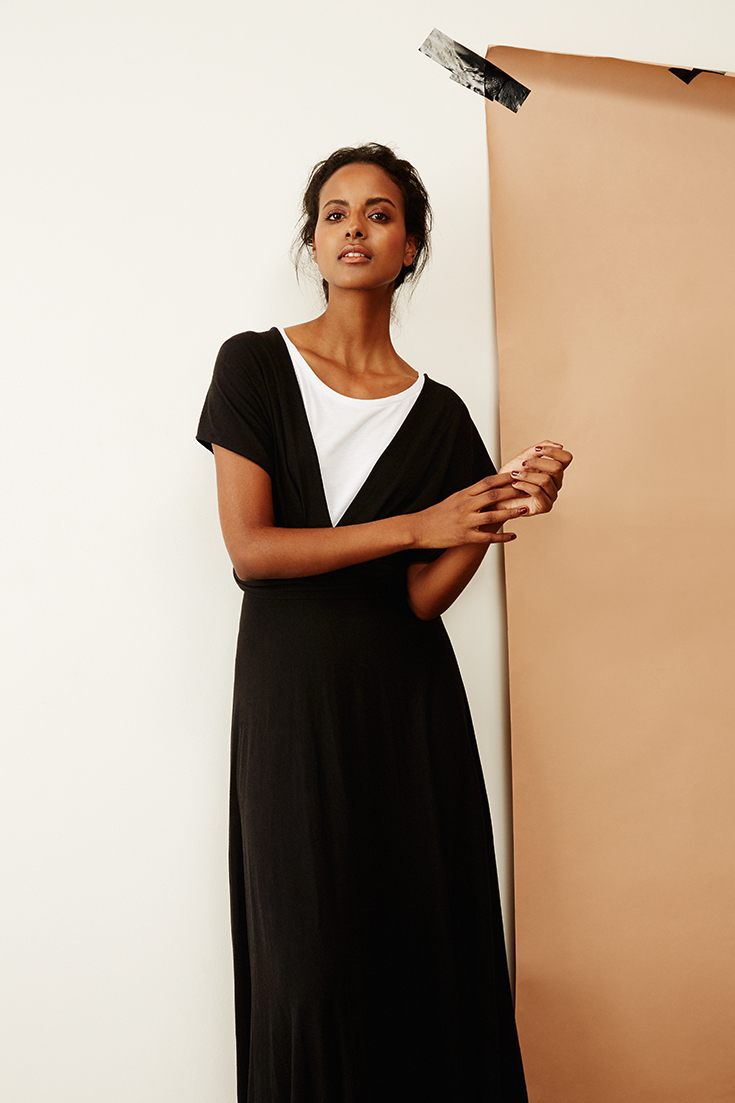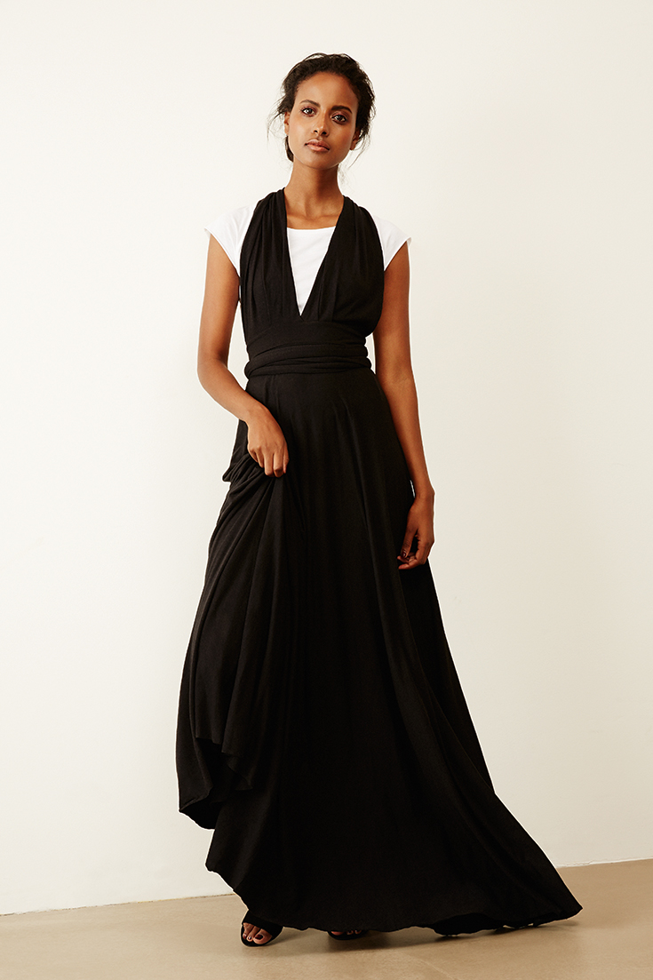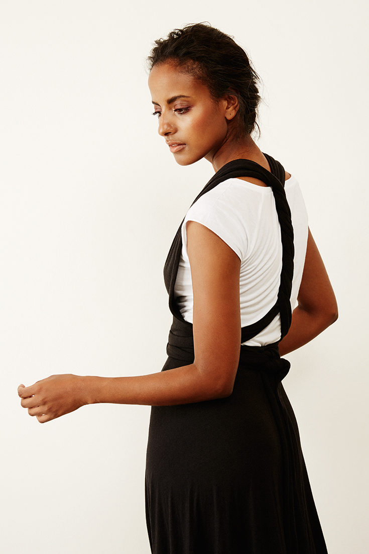 Wandelbares »5-in-1 Long Infinity Dress« aus einem Bambus- und Biobaumwollmix von Orgotton über beadandreel.com, ca. 235 Euro. Das bodenlange Kleid kann dank seines raffiniertes Schnittes und der beiden überlangen Träger auf mindestens fünf unterschiedlichste Art und Weisen drapiert werden. Zwei Styling-Vorschläge seht ihr hier, alle weiteren findet ihr auf beeandreel.com. Weißes T-Shirt aus Bambus von A Continental Brand über Glore Hamburg, 14 Euro.