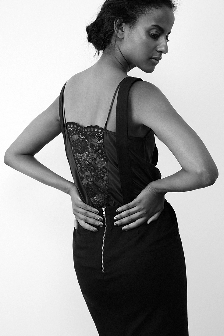 Spitzen-Team – Pencilskirt (mit abtrennbarem Latz) »Bethnal Pinny« und schwarzes Wende-Spitzentop »De Beau Cami« aus Bambus-Seide, beides von P.I.C Style*, ca. 142 Euro und 68 Euro. Das Top kann wahlweise mit tiefem Spitzen-Ausschnitt im Rücken oder vorne getragen werden. Der Latzrock verwandelt sich mit einem Handgriff in einen sexy Pencilskirt.