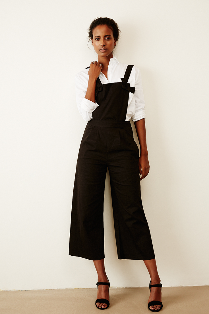 Take a walk on the slow side – Weißes »Hoxton Shirt« und schwarzer »Hackney Jumpsuit« mit abtrennbarem Latz aus Biobaumwolle, beides von P.I.C Style*, ca. 114 Euro und 165 Euro. Im Handumdrehen wird aus der Latzhose eine elegante Culotte. Sandaletten aus Veloursleder mit austauschbarem Absatz von Mime et Moi, 175 Euro (inklusive 2 Absätze). Dank eines super smarten Klick-Systems lassen sich die Mime et Moi Sandalen mit Absätzen in unterschiedlichen Formen und Höhen kombinieren.