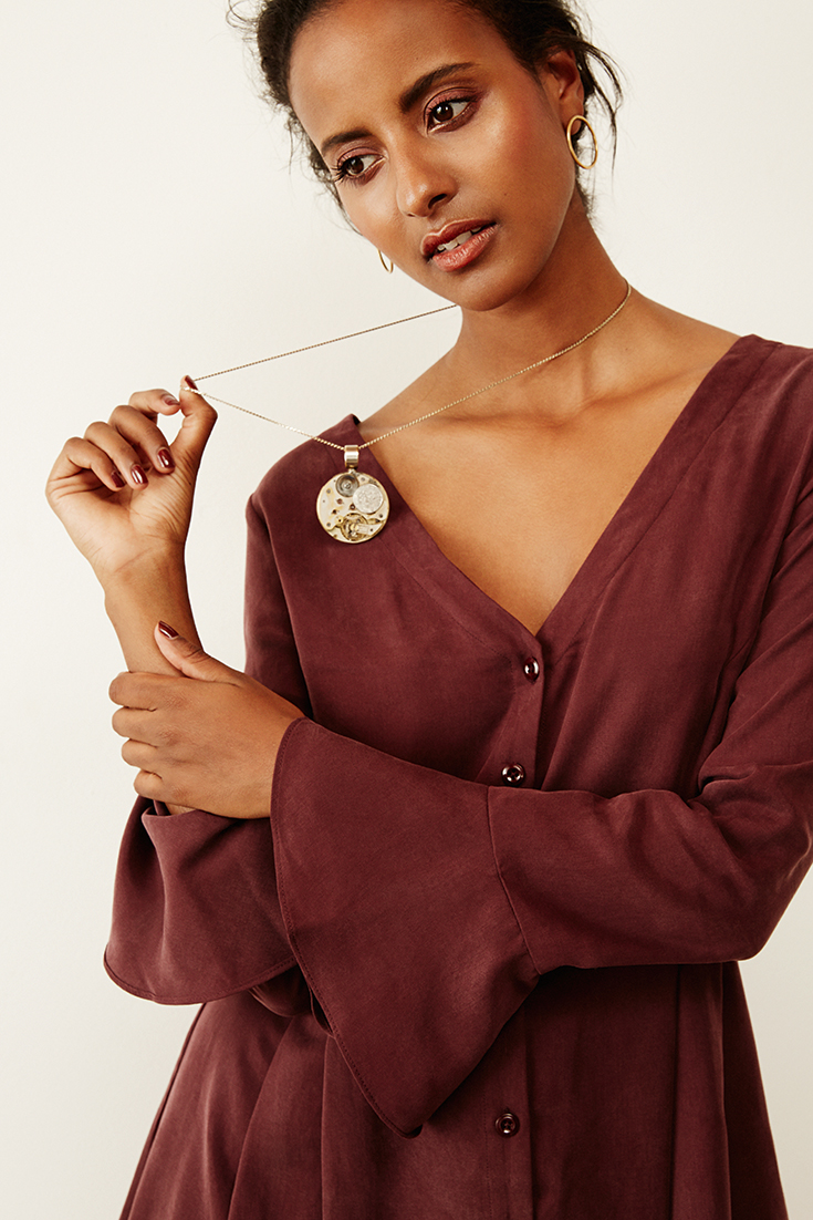 Weinrotes Wende-Kleid (kann wahlweise mit der Knopfleiste vorne oder im Rücken getragen werden) aus Viskose von Vetta, ca. 75 Euro. Fair produzierte »Tiada« Messing-Ohrringe von Folkdays*, 59 Euro. Kette mit Uhrwerk-Anhänger von Peter Sevriens, Preis auf Anfrage. Tasche von Aigner Vintage und Socken (privat). Sandaletten aus Veloursleder mit austauschbarem Absatz von Mime et Moi, 190 Euro (inklusive 2 Absätze).