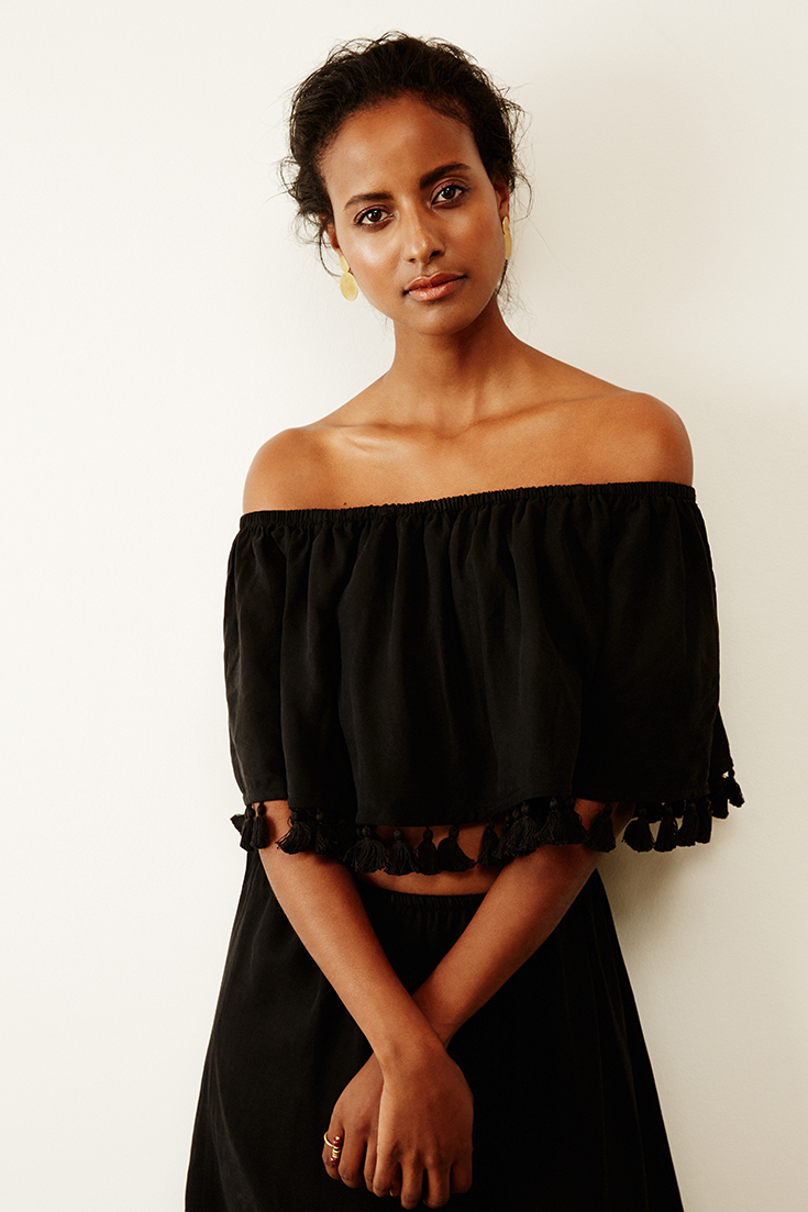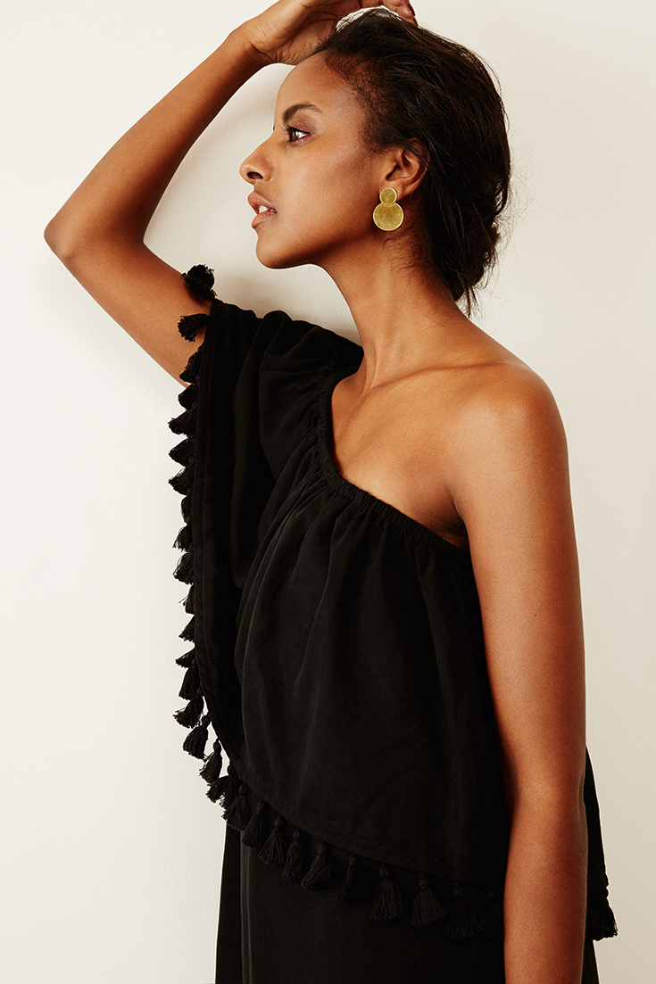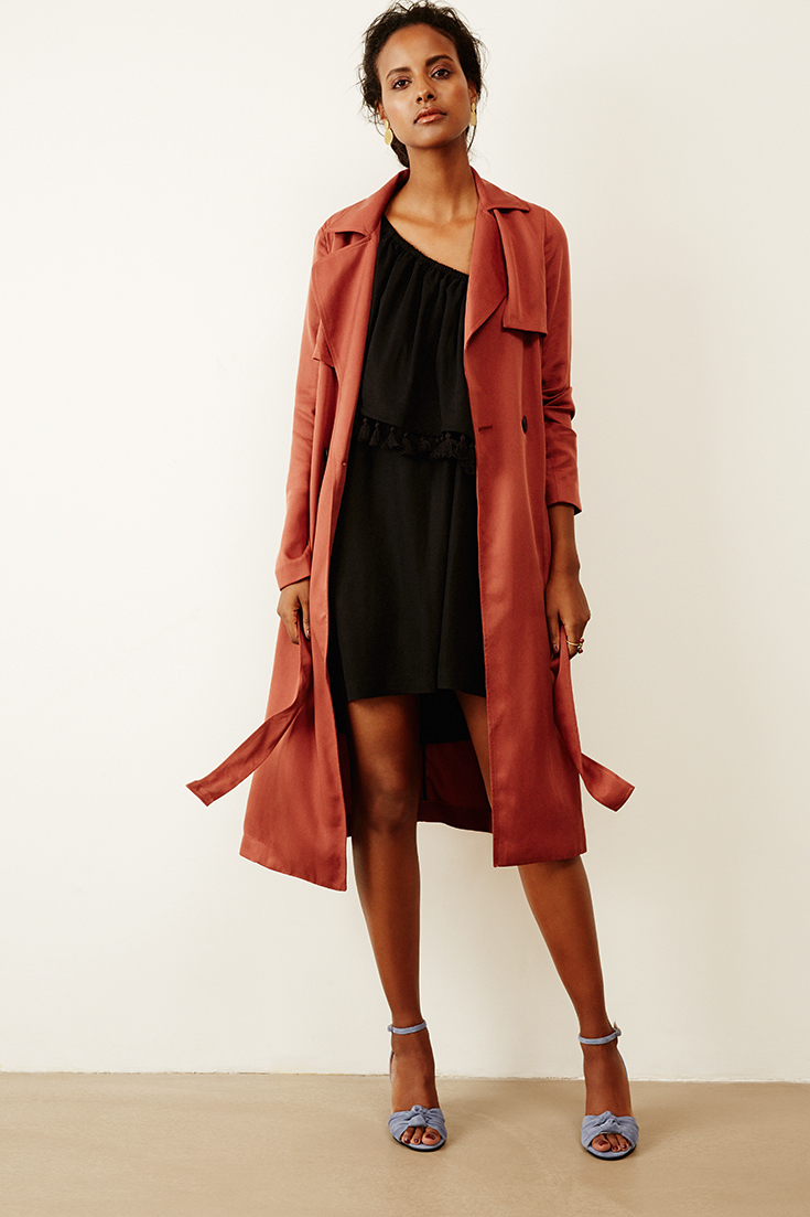 Coole Schulter – Trenchcoat »The Duster« aus Tencel und »The Two Pieces Dress«, bestehend aus einem schwarzen Carmentop und einem Gummizug-Rock aus Tencel, beides von Vetta, ca. 145 Euro und 92 Euro. Das Top kann sowohl symmetrisch als auch als One Shoulder Top und entweder in Kombi mit dem Rock als Zweiteiler oder als »Kleid« und natürlich auch solo zu Jeans und Co getragen werden. Der Rock wiederum kann dank seines flexiblen Gummizugbundes auch ruckzuck zum Bandeau-Kleid umfunktioniert werden. Sandaletten mit austauschbarem Absatz von Mime et Moi, 190 Euro (inklusive 2 Absätze). Fair produzierte Messing-Ohrringe »Nyota« von Folkdays*, 79 Euro. Tipp: Die Ohrringe lassen sich variieren und auch als kleine runde Stecker tragen. Fair produzierter »Candy Stick Ring« von Hiitu, 65 Euro.