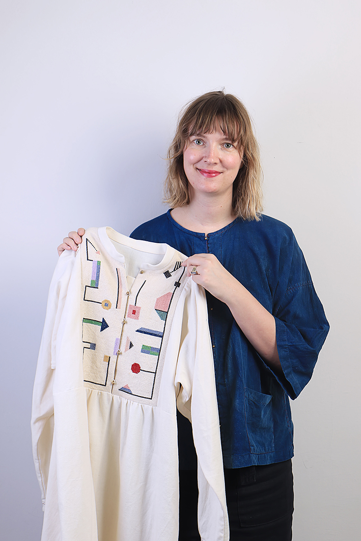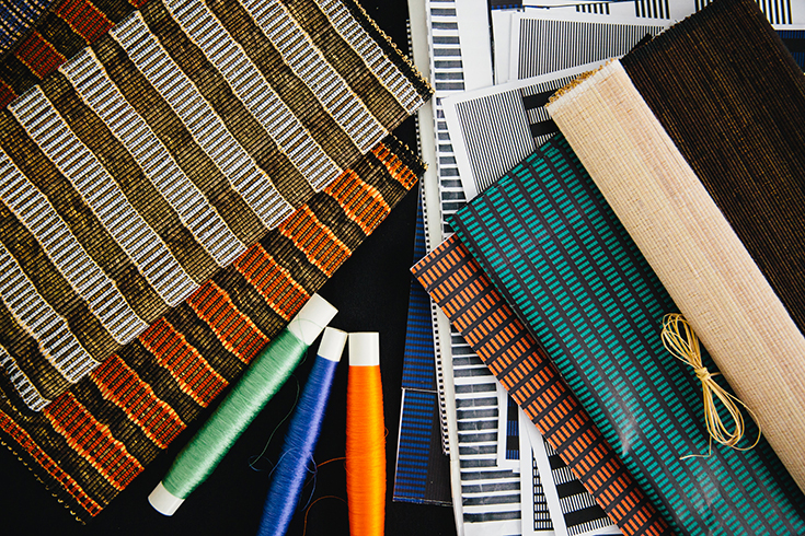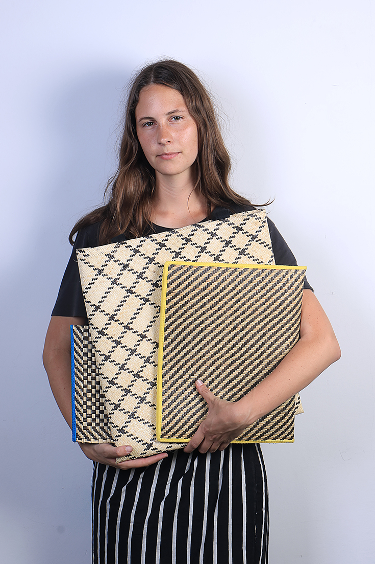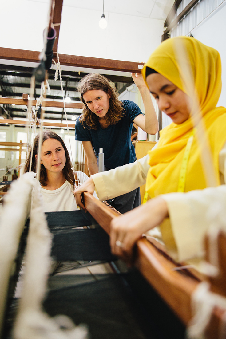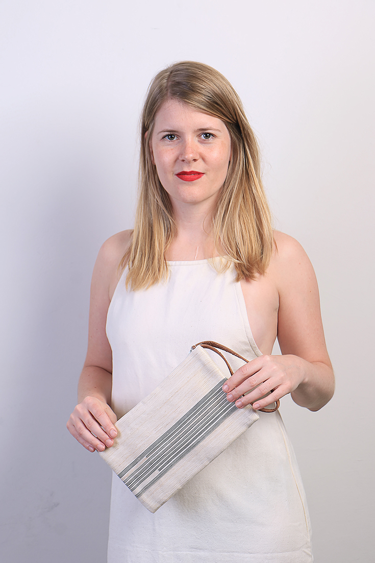 Als Anna und Franzi zu Beginn ihrer dreiwöchigen Textilresidenz der Juniorweberin Minh zum ersten Mal ihre puristischen Design-Entwürfe vorlegen, die sich vor allem durch gerade Linien auszeichnen, spüren sie, dass die zierliche 20-jährige beinahe enttäuscht ist, dass sie so etwas Einfaches am Webstuhl umsetzen soll. »Ich glaube, für die meisten war es zunächst ziemlich irritierend, dass wir uns bei unseren Mustern für das Einfachste vom einfachen entschieden hatten und bloß simple Linien umsetzen wollten, statt hochkomplexe und riesige ornamentale Muster. Denn hier gilt die Maxime – je aufwendiger und teurer das Material, desto besser. Aber wenn man plötzlich in der Situation ist, dass man gestalterische Allgemeinplätze permanent erklären muss, lernt man auch viel über die eigene Haltung. Umgeben von Glitzer, Gold und Opulenz stellt man die eigene Neigung zur Reduktion schnell infrage – das tut etwas weh, vor allem aber gut. Beide Seiten müssen sich zunächst von alten Denkmustern befreien, damit etwas Neues entstehen kann«, erläutert Anna den gemeinsamen Designprozess. Am Ende der drei Wochen sind gut ein halbes Dutzend  Taschen- und Laptop-Taschen-Prototypen entstanden, mit denen alle Beteiligten hochzufrieden sind und denen die Fusion von Ost und West deutlich anzusehen ist.