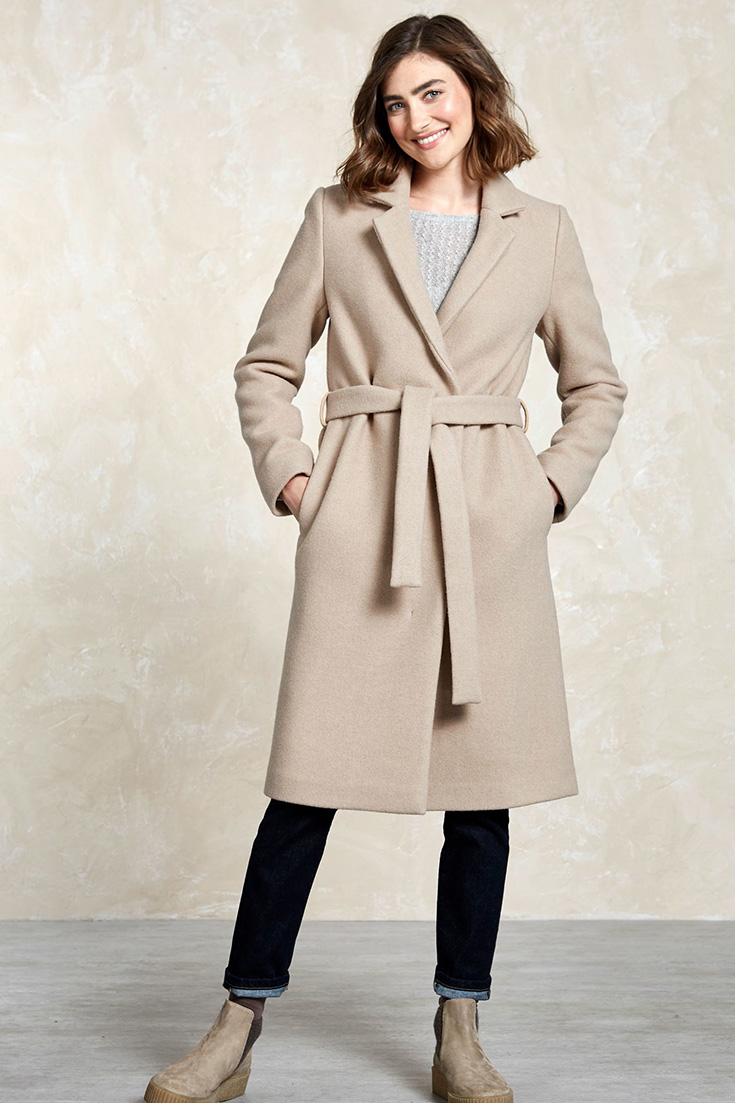 Der melierte Oversize Eco Mantel aus Wolle von Elementy ist ein Gemütlichkeits-Garant. Der lockere Schnitt macht den faire Mantel cool und klassisch zugleich. Der extra breite Gürtel gibt dir die Freiheit, dich voll und ganz in den nudefarbenen Mantel einzuschmusen. In den Seitennähten sind Taschen versteckt – zum Kastanien sammeln und Hände wärmen. Elementy designt und fertigte seine Kollektionen komplett in Polen. 170,72 Euro über elementywear.com.