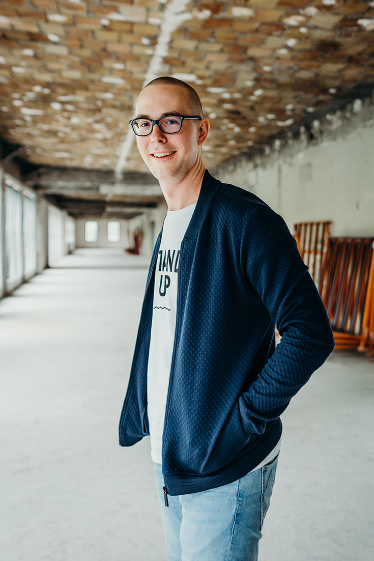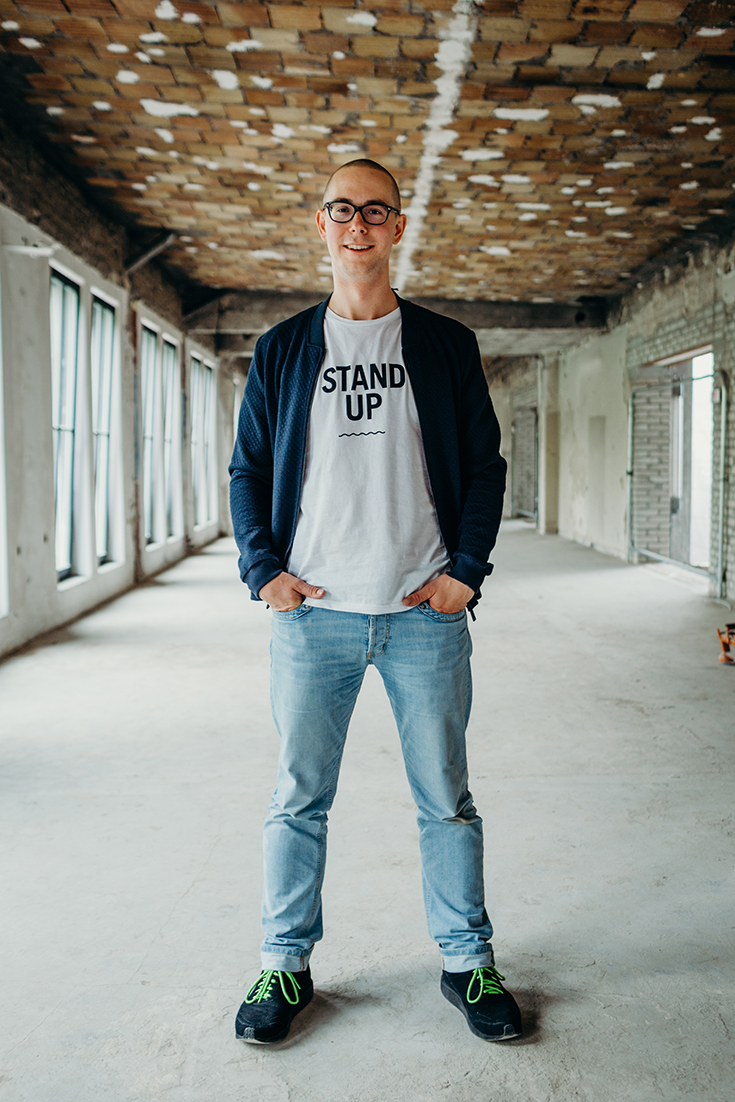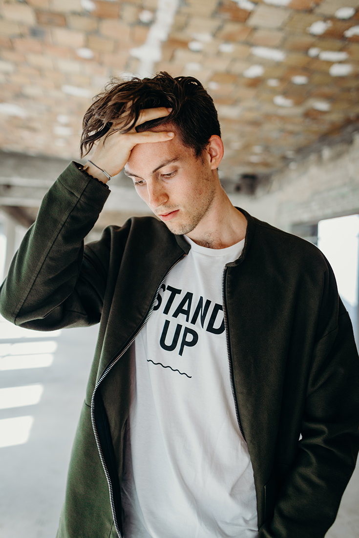 Jan vom Blog Jan trägt Grün trägt eine Jacke von Greenbomb* und darunter unser Stand-Up T-Shirt, Jeans von Mud Jeans*, Sneaker von Lunge Manufaktur.