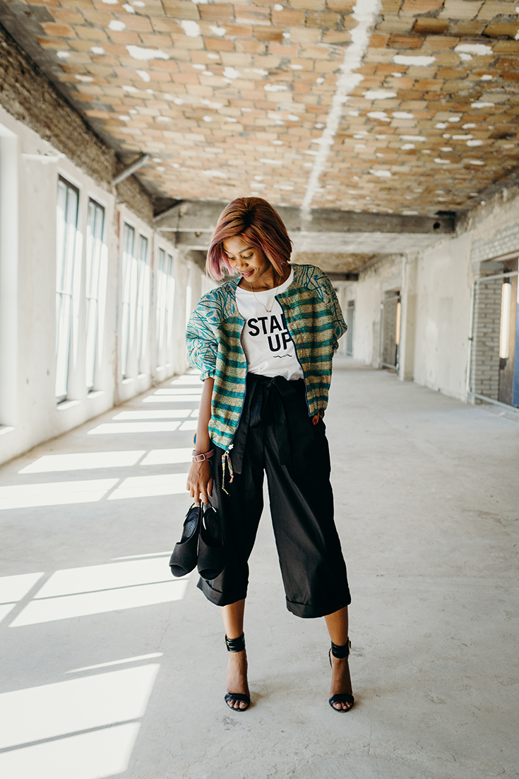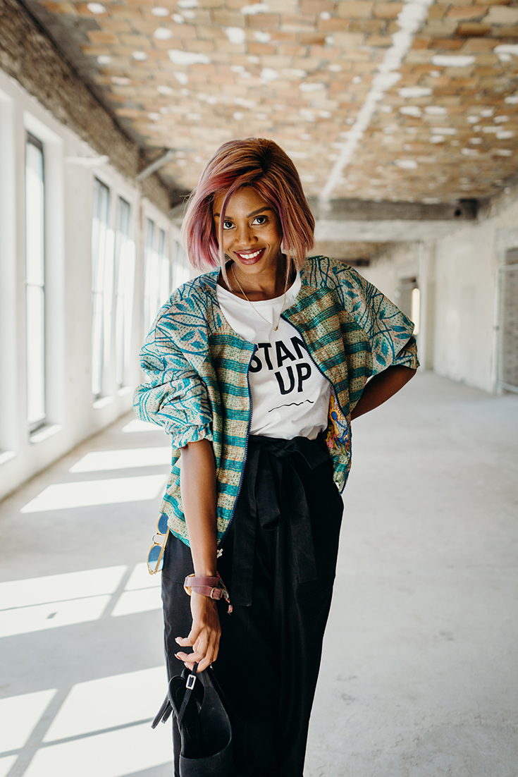 Leah Misika von Lmlmode trägt eine Jacke von Maria Seifert* und darunter blitzt unser Stand-Up T-Shirt in Kooperation mit Waterkoog hervor, Hose von Myrka Studios. Sandaletten von Opificio V. Armbanduhr von Timeboo.