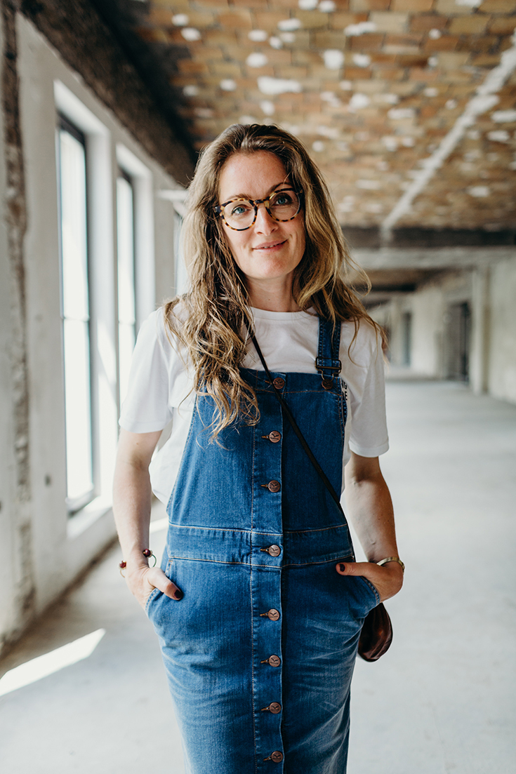 Bodil Louis trägt zu zum Stand-Up T-Shirt von Waterkoog X Peppermynta eine Hose von Movinun.