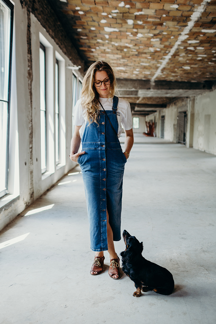 Ich selbst bin in ein Denim-Latzkleid aus Organic Cotton von Feuervogl* geschlüpft. »Nothing to hide« T-Shirt aus Organic Cotton von Armedangels* (privat). Ledertasche und Schuhe (privat). Brille von Viu (privat). Schmuck von Hiitu (privat). Und Pelle zeigt sich wie immer in Künstlerschwarz, beziehungsweise von seiner natürlichsten Seite.