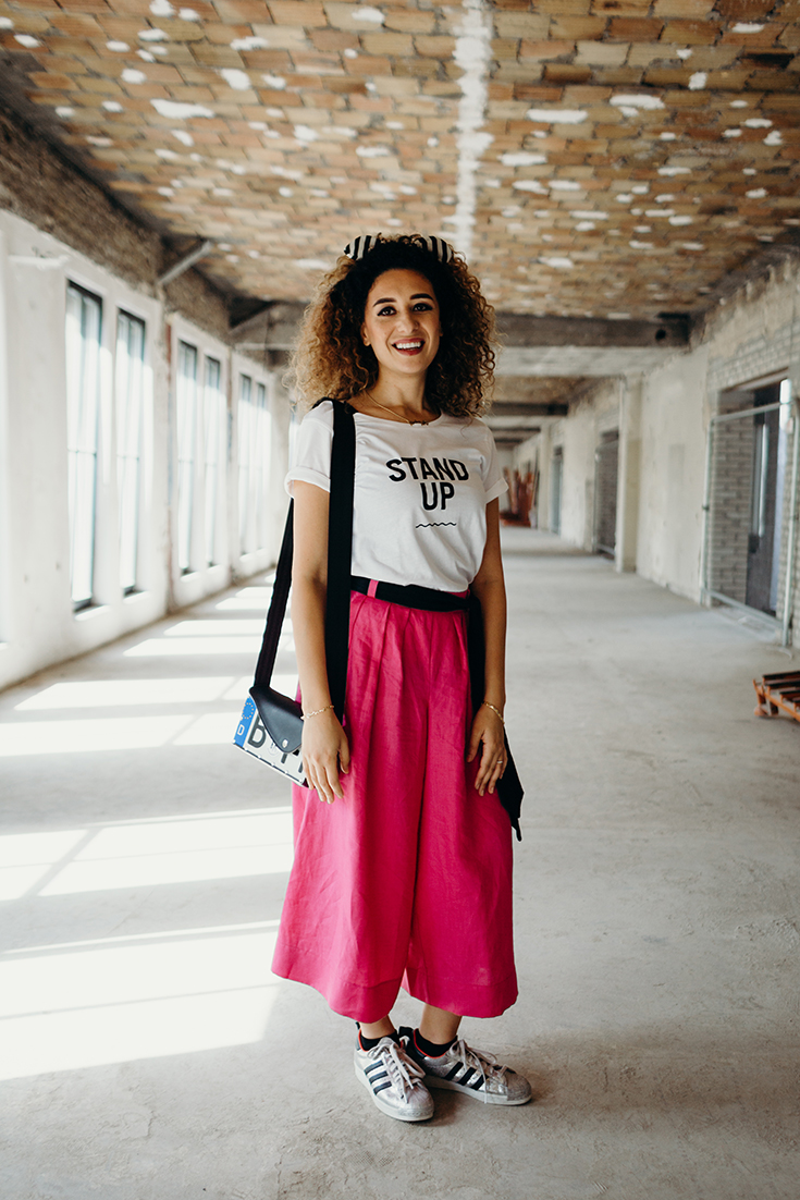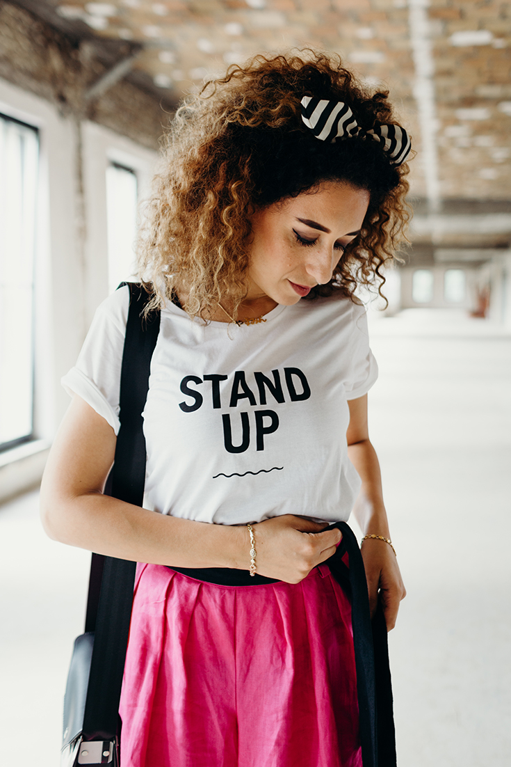 Yasmin von Curlseverywhere hat das Stand-Up T-Shirt von Waterkoog X Peppermynta mit einer pinken Hose von Kokoworld* kombiniert.