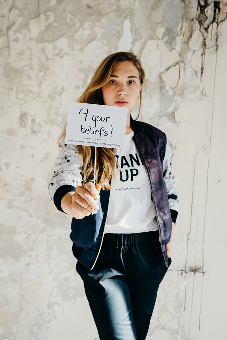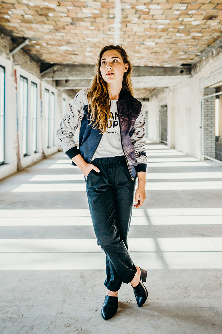 Doppelt hält besser: Alex, der Freund von Justine kept calm & went vegan und Justine tragen beide unser Stand-Up T-Shirt (siehe Aufmacher), welches wir in Kooperation mit dem Hamburger Label Waterkoog entworfen haben. Alex hat dazu eine Jacke von Myrka Studios kombiniert und Justine trägt einen Blouson von Feuervogl*.