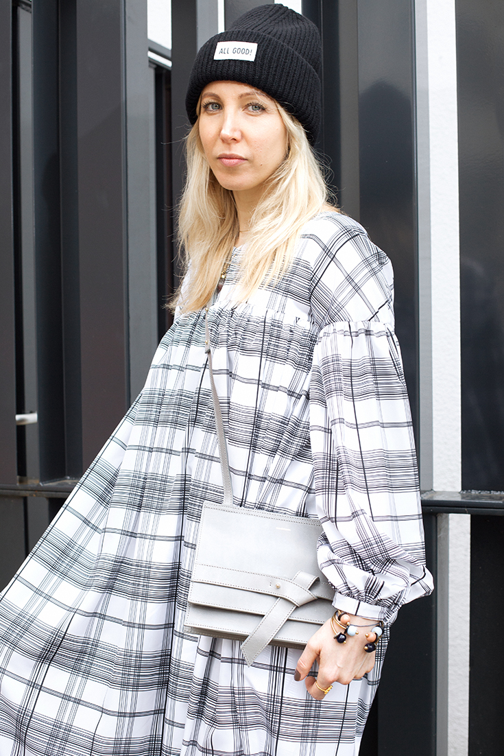 Bina in einem Karierten Maxi-Kleid mit weiten Ärmeln und Loose-fit, aus 100% recycelten PET-Resten von Jan ‘n June, 130 Euro. Veganer Canvas-Boot von Ethletic, 99,90 Euro. Hellgraue Tasche aus der Serie aus pflanzlich gegerbtem Leder von Naditum, 349 Euro. Wollmütze mit Kaschmir, in familienbetriebener Handarbeit entstanden, von Merz b. Schwanen, 80 Euro. Armspangen von Hiitu, je 75 Euro. Ring mit großer und kleiner Sonnenblume, aus vergoldetem und recyceltem Silber, von Macimo je 125 Euro. Kette aus vergoldetem Messing mit kleinem Harlekin-Kristall-Anhänger von Mirabelle Jewellery, 80 Euro. Schmaler goldener Halsreif, handmade in Germany, von Ariane Ernst, 89 Euro.