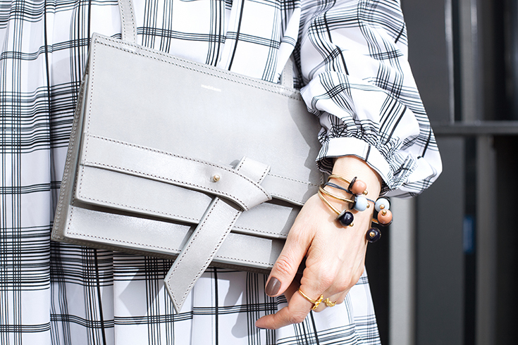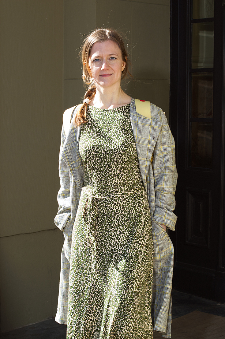 Maxikleid aus weichem Jersey von King Louie, 114,95 Euro. Karierter Mantel aus Hanf mit Bio-Baumwolle, von Lanius um 239,90 Euro. Senfgelber Rucksack aus 100% recyceltem PET, geräumig und mit Laptop-Fach, von Pinqponq über Glore Hamburg, um 89,90 Euro. Schwarz-weißes Club-Armband, privat.