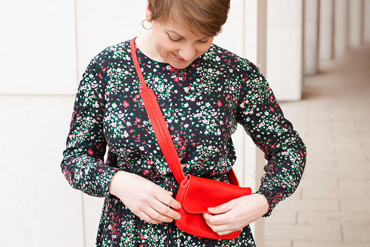 Janine rockt ein schwarzes Kleid aus Ecovero von Armedangels, um 119,90 Euro. Hipbag in Lipstick-Rot aus chromfrei gegerbtem Leder von Nine To Five, 155 Euro. Goldene, handgefertigte Ohrringe aus Messing von People Tree*, 20 Euro, alles über Werte Freunde.