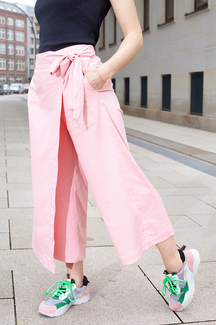 Lynn in einer rosa Culotte mit Wickeleffekt aus Bio-Baumwolle von Lanius, 159,90 Euro. Schwarzes Top aus Bio-Baumwolle, in Deutschland produziert von Lovjoi, 55 Euro. Multicolour-Sneaker mit Mesh, fair und nachhaltig in einer spanischen Manufaktur produziert von Maison Mangostan, 163 Euro. Handgestrickter XXL-Sweater in Hellgrau, aus recyceltem Kaschmir von Natascha von Hirschhausen, 589 Euro. Shopper aus vegetabil gefärbtem Leder von O My Bag über Werte Freunde, 269 Euro. Goldenes Armband aus recyceltem Messing mit Anhänger von Fremdformat über Werte Freunde, 39 Euro. Armreifen, handgefertigt in London und aus recyceltem Silber von Wild Fawn über Werte Freunde, je ca.50 Euro. Vergoldete Armbänder aus der Kölner Manufaktur Pikfine, je ab 40 Euro. Vergoldeter Ring von Pikfine, aktuell im Sale für 29,90 Euro. Verlobungsring aus eco-fairem Gold und mit Stein von Jan Spille, Preis auf Anfrage.