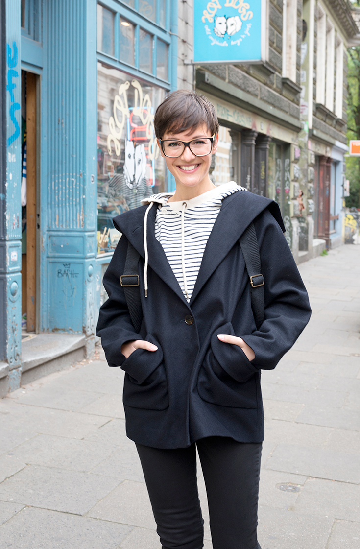 Marine-Look in Hamburg? Passt! Navyblauer Kurzmantel »Nia« von Cus aus recycelter Wolle und mit Kapuze, 159,50 Euro. Hoodie »Ava Stripes« aus Bio-Baumwolle von Armedangels, 39,95 Euro. Skinny Jeans »Tilly Black« von Armedangels, 49,95 Euro.