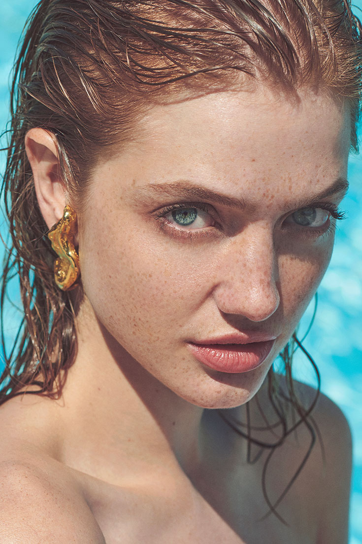 BLACK BEAUTY – Badeanzug aus recyceltem Econyl von Woodlike Ocean*, 136 Euro. Badetuch aus Fair Trade zertifizierter Bio-Baumwolle von Yumeko* für 42,95 Euro. Goldohrringe von Makua Jewelry, ca. 153 Euro.