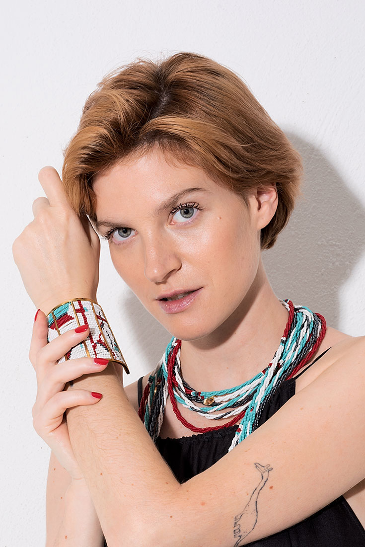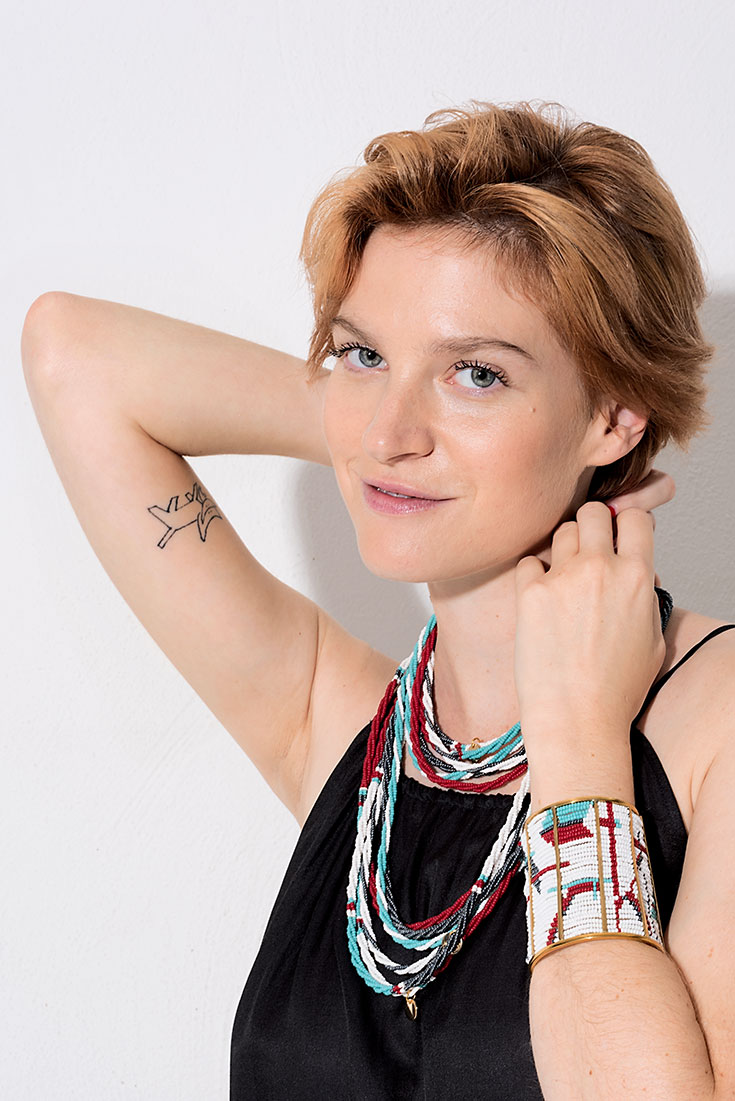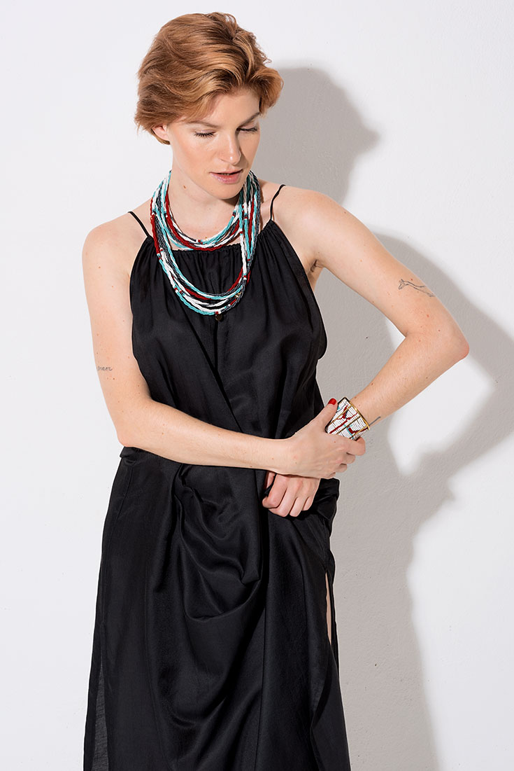 Das luftige Schwarze – Weitgeschnittenes, handgewobenes Kleid aus Biobaumwoll- und Seidengemisch (70% Organic Cotton und 30 % Peace Silk) mit hohen Seitenschlitzen von Jungle Folk*, 246 Euro. Handgemachte Body Necklace und passender Massai-Armreif»Red Turquoise« aus Glasperlen, beides von Hiitu, 110 Euro und 195 Euro.