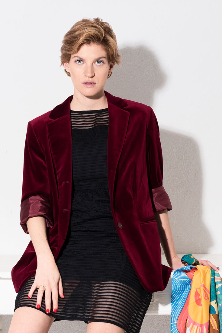 Antistress-Dress – Weinroter Samtblazer über kleiderei.com, 49 Euro im Kleiderflatrate-Monatsabo. Ausgestelltes Kleid »Striped Lace Dress« mit transparenten Streifen aus Tencel sowie einem Biobaumwoll- und Seidengemisch (30 % Organic Cotton und 70 % Peacesilk) von Wunderwerk*, 199,95 Euro. Gemustertes Seidentuch »Scarf Sun« aus Peace Silk von Hiitu, 125 Euro. Gestreifte »Lary Blanket« aus Alpakawolle aus der Inspired By-Kollektion von Folkdays*, 199 Euro. Mit Perle verzierter »Lizet Ring« von Folkdays*, 64 Euro.