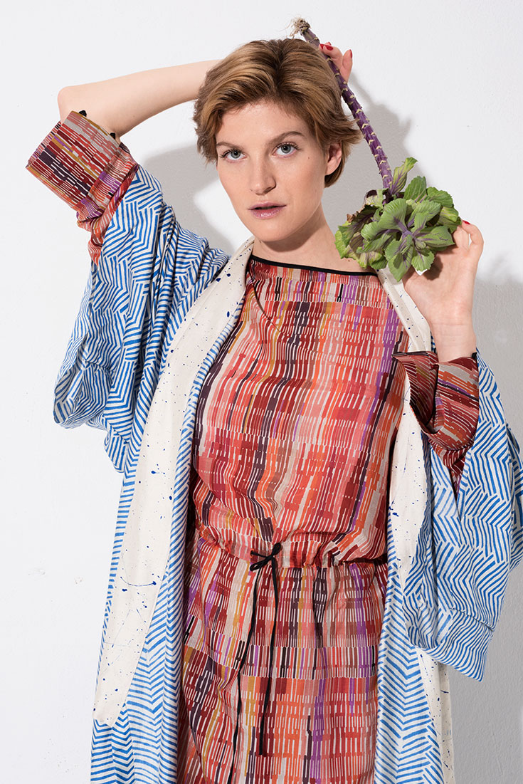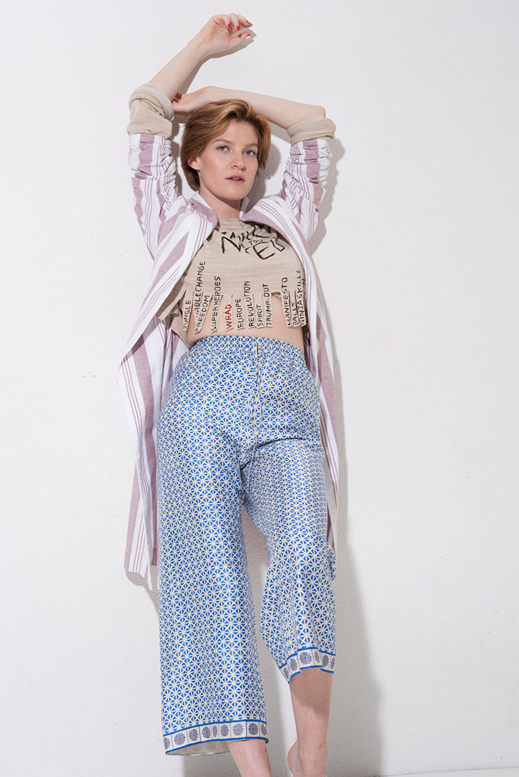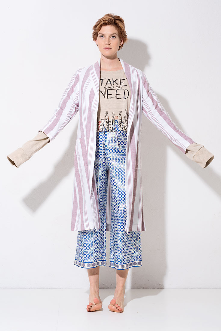 Fashion Note(s) – Gestreifter »Prema Coat« aus handgewobener Baumwolle von Jungle Folk*, 224 Euro. Cropped »Take What You Need« Sweater aus 100 % Hanf von Wråd über yoox.com, 123 Euro. Gemusterte »Melissa Hose« aus Wildseide, aus der Inspired-by-Kollektion von Folkdays*, 119 Euro.