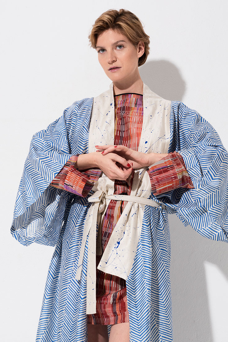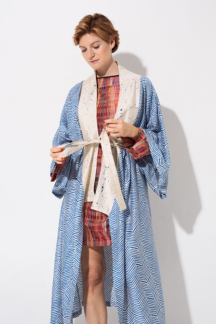 Let’s go Kimono! – Blauweiß gemusterter »Melodie Kimono« aus Wildseide, aus der Inspired-by Kollektion von Folkdays*, 269 Euro. Buntgemustertes Ethnokleid mit Taillengürtel aus Biobaumwoll-Seidengemisch von Lanius*, 139,90 Euro. Türkisfarbene Hightop Sneaker aus Organic Cotton von Ethletic*, 74,90 Euro.