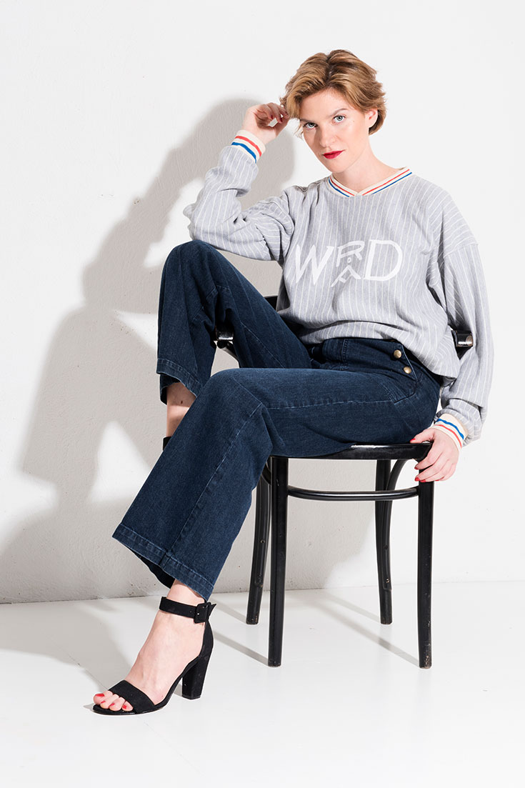 Fair Jeans Flair – Gestreifter Unisex-Sweater aus Organic Cotton mit handbemalten Details von Wråd über yoox.com, 145 Euro. Flared Jeans »Amara« mit Knopfleiste aus Organic Cotton von Armedangels*, ca. 120 Euro. Vegane Sandaletten von Beyond Skin*, ca. 150 Euro. Weißes T-Shirt T-Shirt »Éthical« aus Biobaumwolle von Dariadéh, 35 Euro.