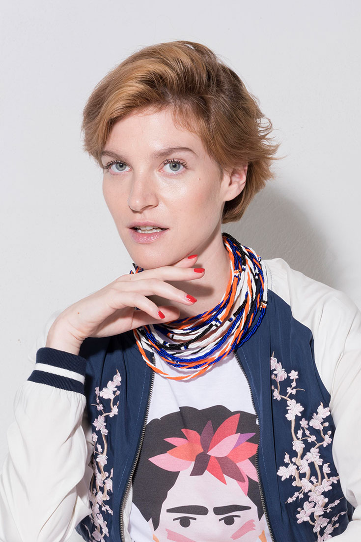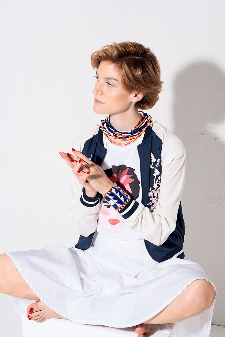 Pola on the block – Bestickter Blouson »Cherry Blossom« aus Tencel von Wunderwerk*, 179,95 Euro. T-Shirt mit Frida-Kahlo-Print aus Organic Cotton von TheColorfulCrew, 49 Euro. Ausgestellter, weißer »Poplin Midi Skirt« mit aufgesetzten Taschen aus Organic Cotton von Wunderwerk, 119,95 Euro. Perlenbesetzte Body Necklace und Massai-Armreif »Orange Blue« von Hiitu, 110 Euro und 195 Euro.