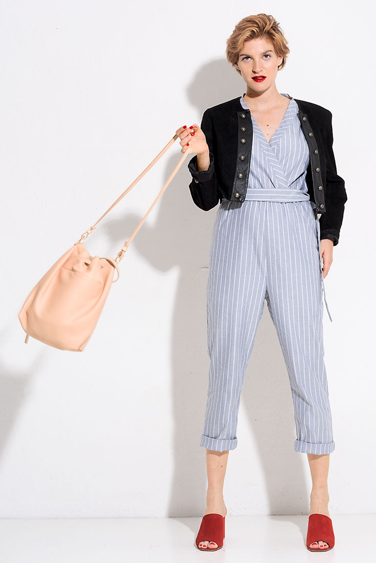White Stripes – Cropped Vintage-Jacket aus Veloursleder über kleiderei.com, 49 Euro im Kleiderflatrate- Monatsabo. Gestreifter Overall mit Bindegürtel aus Organic Cotton von Jungle Folk*, 250 Euro. Rote Mules aus Veloursleder von Aeyde (Vintage). Roséfarbene Bucket Bag aus pflanzlich gegerbtem Leder von Lellor, 190 Euro.