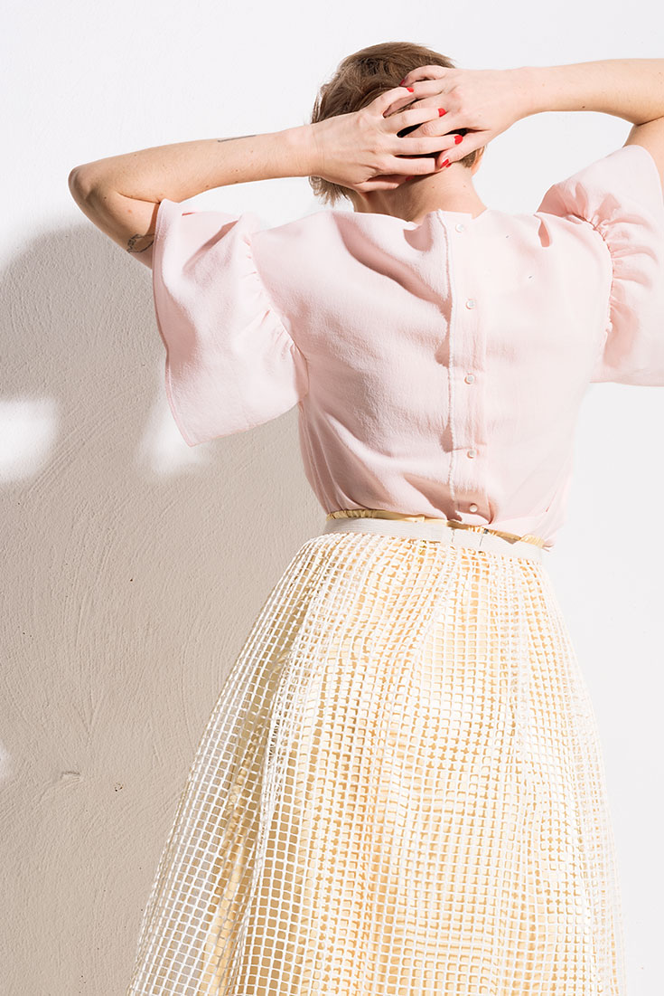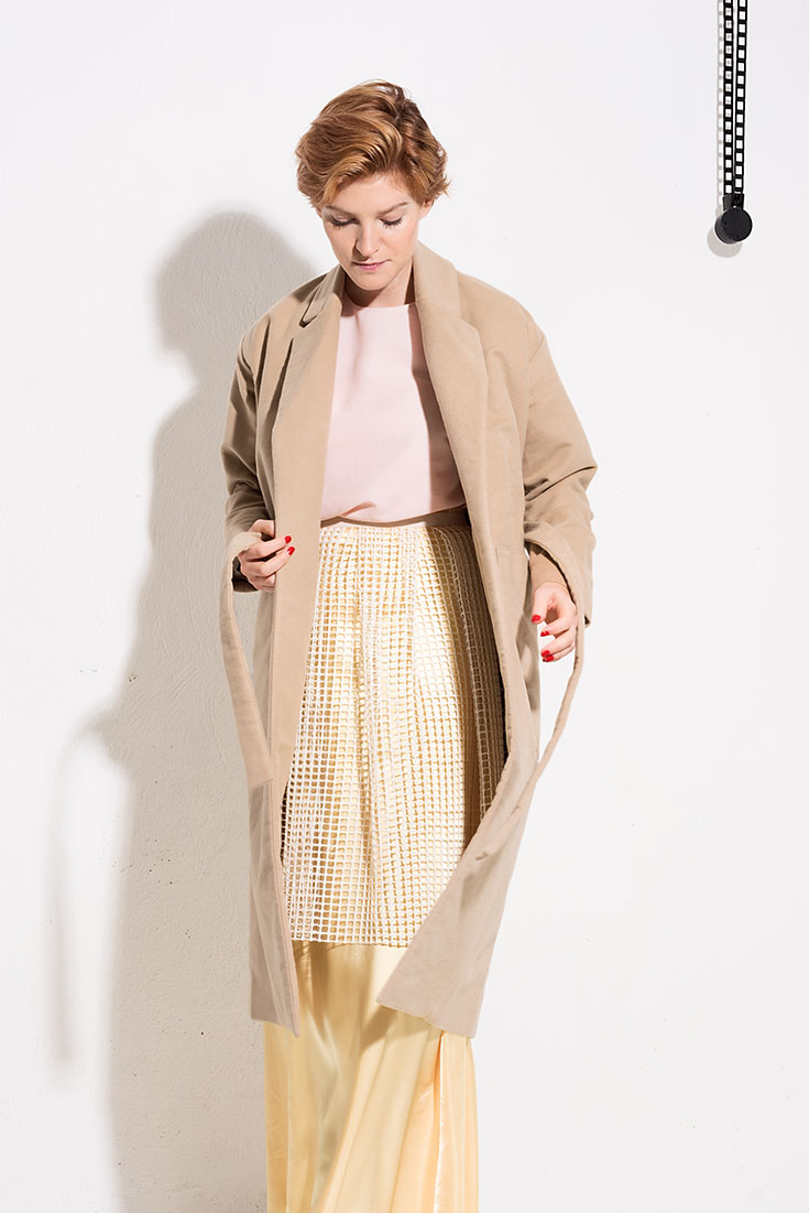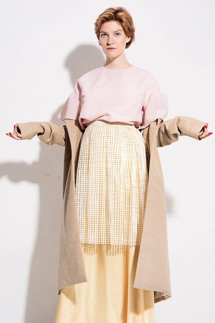 Shades of Pastell – Roséfarbene Seidenbluse mit XL-Rüschenärmeln und Knopfleiste im Rücken von De Lostanges, 125 Euro. Ausgestellter Rock mit Gummizug, gefertigt aus Teppichstoff-Haftgitter von Louise Tresvaux du Fraval, 150 Euro, beides über delostanges.com. Vanillefarbener, knöchellanger Vintage-Satinrock über kleiderei.com, 49 Euro im Kleiderei-Monatsabo. Veganer Mantel »Yaël« mit Bindegürtel aus Organic Cotton von Myrka Studios, 350 Euro.