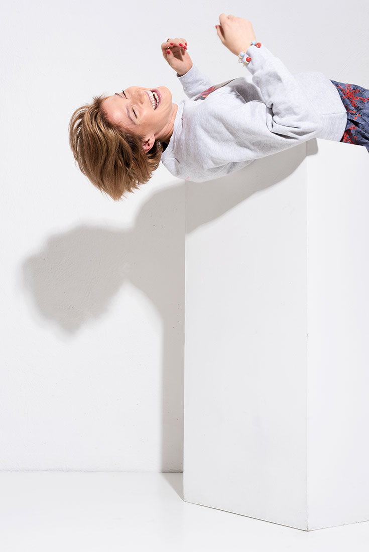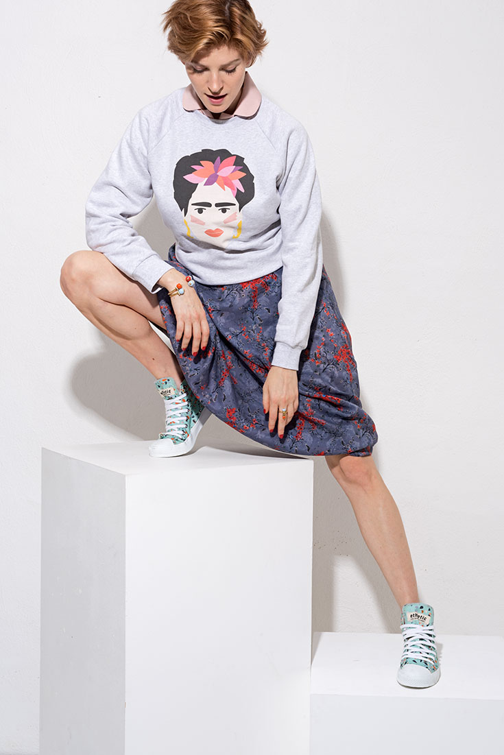 Fusion Style – Sweater mit Frida-Kahlo-Print aus Organic Cotton von TheColorfulCrew, 79 Euro. Nudefarbene Bluse aus recyceltem PET von Myrka Studios, 160 Euro. Gemusterter Maxirock aus Tencel von Lanius*, 119,90 Euro. Hightop Sneaker aus Organic Cotton von Ethletic*, 74,90 Euro. Armreif »Candy Babyblue«, Armreif »Coral« und Candy Stick Ring »Coral/Baby Blue«, alles von Hiitu, je 75 Euro und 65 Euro.