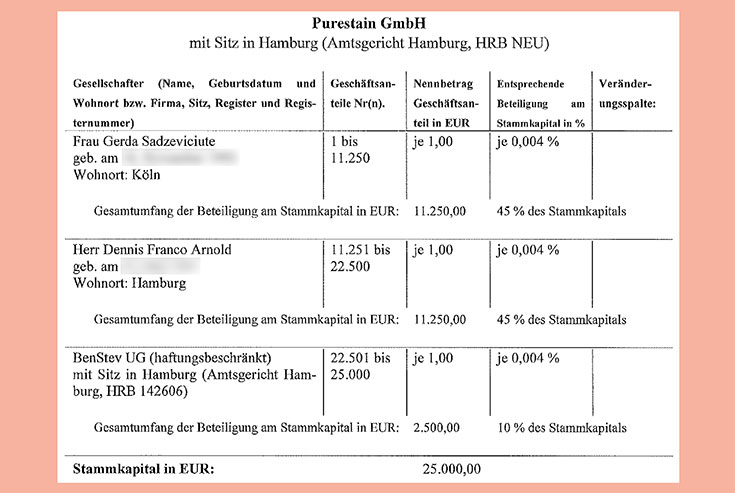 Quelle: Auszug aus der Gesellschafterliste von Purestain GmbH