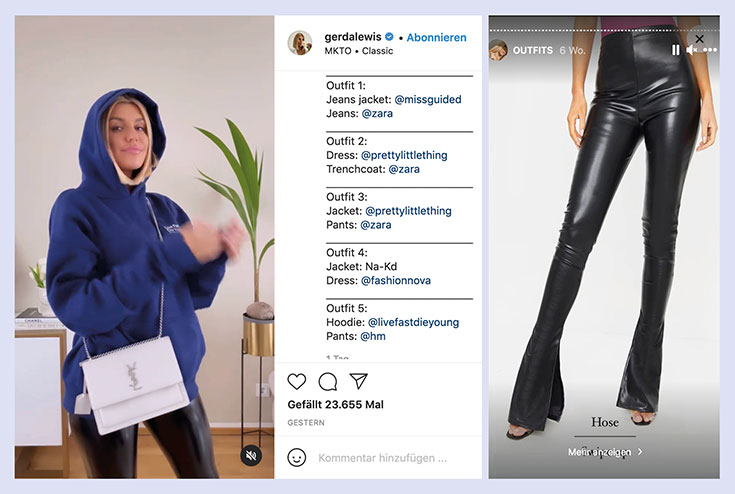 Wie auf dem Bild oben von Gerda Lewis auf Instagram zu sehen. Heute Fast Fashion von Zara, Na-Kd, Prettylittlething oder H&M und morgen ein eigenes Eco Fashion Label? Wenn wir durch die Instagram-Stories und Postings von Gerda Lewis scrollen, bekommen wir gleich Fast-Fashion-Frust. Zum Beispiel von der Plastiklederhose der Marke Prettylittlething, die Gerda Lewis, wie oben auf dem Bild ersichtlich, in ihrer Story geteilt hat. 16 Pfund, also rund 18 Euro, soll die Hose, die im Prettylittlething Onlineshop angeboten wird, kosten. Wir kriegen das persönlich irgendwie nicht zusammen: Gefühlt jeden Tag ein neues Outfit und Empfehlungen für Fast Fashion-Konzerne, die wirklich alles andere als nachhaltig, geschweige denn fair oder sozial herstellen, aber dann ein Eco Fashion Label wie Purestain gründen?