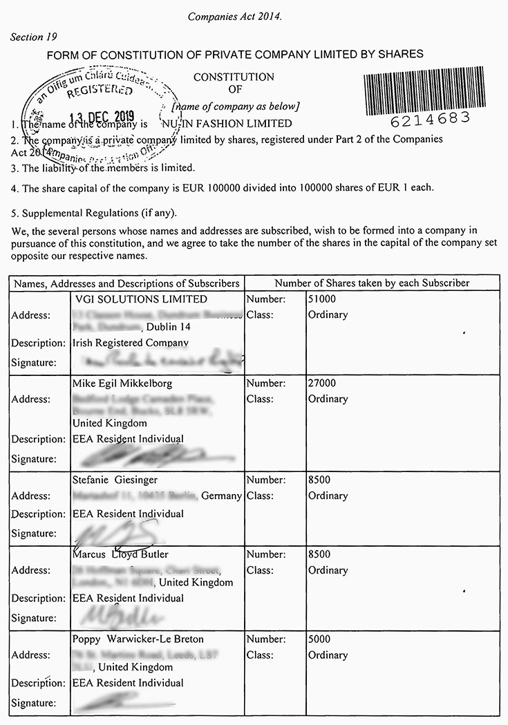 Wir haben uns auch dazu entschlossen, noch tiefer in die Marke einzutauchen. Offiziell heißt die Firma NU-IN Fashion Limited. Die Investoren von VGI Solutions Limited halten die Mehrheitsanteile von 51%, Mike Mikkelborg hat 27% der Anteile, Poppy Warwicker-Le Breton hält 5%. Und Stefanie Giesinger und Marcus Butler halten jeweils 8,5% der Anteile und haben jeder 8.500 Euro eingelegt. Damit würde ich persönlich NU-IN alles andere als »ihre« Marke bezeichnen. Was ich ebenfalls merkwürdig finde, dass sie in der Öffentlichkeit als Markeninhaber*innen positioniert werden. Außerdem werden auf der Homepage von NU-IN diese vier als Gründer genannt: Mike, Poppy, Marcus und Stefanie. Daher ist mir auch nicht klar, warum die NU-IN Fashion Limited ihren Geschäftssitz in Irland hat – und nicht in Deutschland oder Großbritannien, wo Stefanie, Marcus und die anderen zwei Founder ihren Wohnsitz haben. Wie wir in einem sehr interessanten Beitrag »Irland – Steuerparadies für Großkonzerne« von Arte gelernt haben, soll Irlands ja ein wahres Steuerparadies sein.